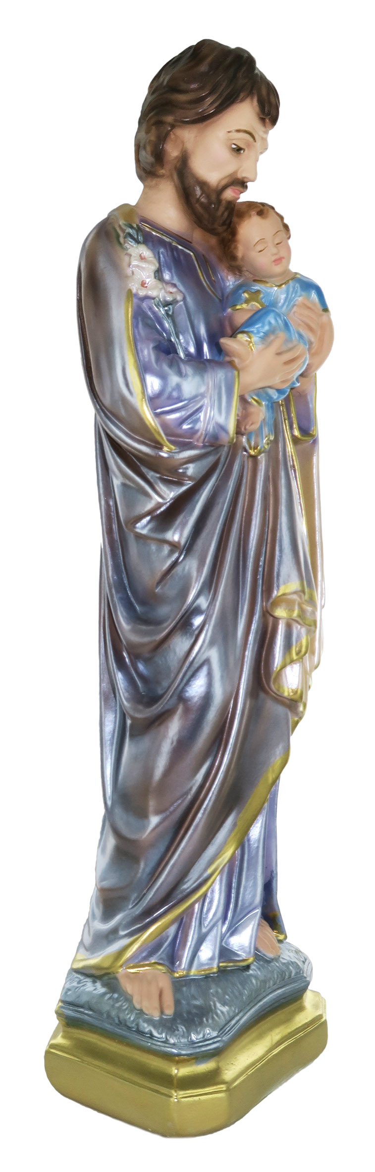 Questa statua di San Giuseppe da 40 cm è realizzata artigianalmente in Italia e si distingue per la qualità della fattura e per il sapiente uso dei colori. L'effetto madreperlato rende le tinte molto lucenti e arricchisce la figura del patrono della Chiesa cattolica e dei lavoratori di suggestivi riflessi, donandole un aspetto elegante e pregiato. La statua di S. Giuseppe è ideale per grandi nicchie o luoghi di culto giuseppini. La luce delle fiammelle dei lumini o di faretti esalterà ulteriormente l'effetto iridescente della sua rifinitura madreperlacea.