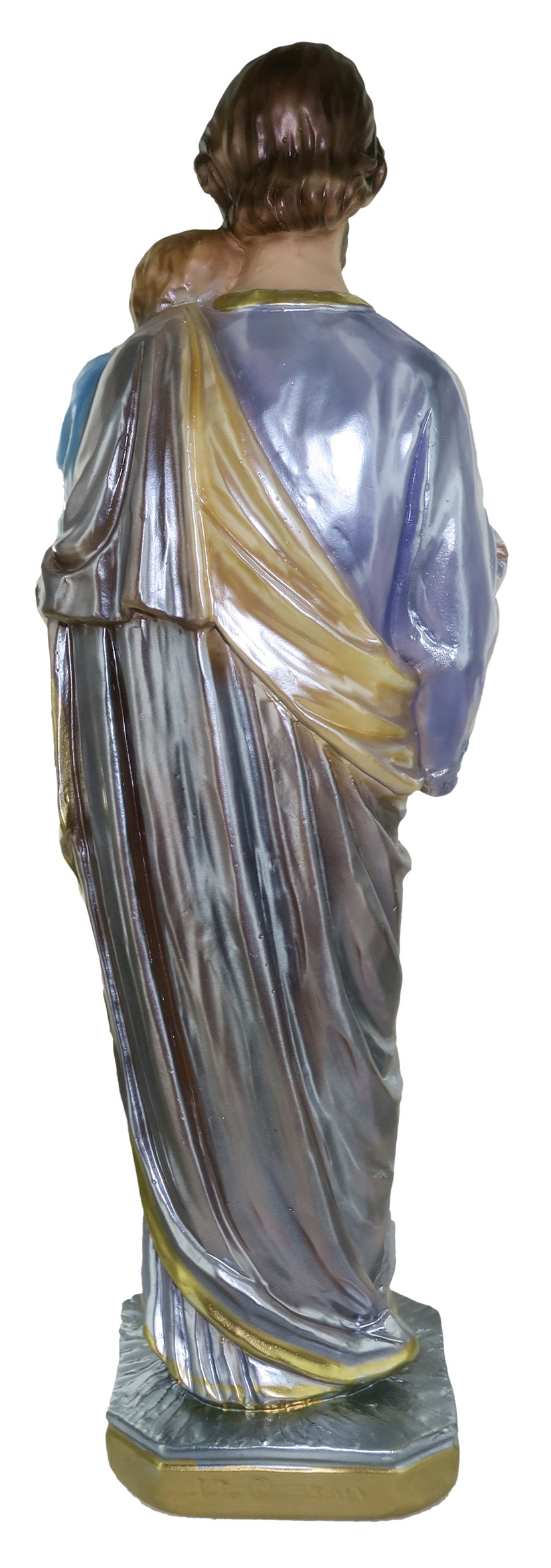 Questa statua di San Giuseppe da 30 cm è realizzata artigianalmente in Italia e si distingue per la qualità della fattura e per il sapiente uso dei colori. L'effetto madreperlato rende le tinte molto lucenti e arricchisce la figura di suggestivi riflessi, donandole un aspetto elegante e pregiato. La statua di S. Giuseppe è ideale per nicchie o luoghi di culto dedicati a San Giuseppe, ma può anche essere esposta in casa come soprammobile o in una vetrinetta. Sarà sicuramente un’idea regalo particolarmente apprezzata dai devoti a questo santo, dichiarato patrono della Chiesa cattolica dal beato Pio IX l'8 dicembre 1870. La luce delle fiammelle dei lumini o di faretti esalterà ulteriormente l'effetto iridescente della sua rifinitura madreperlacea.