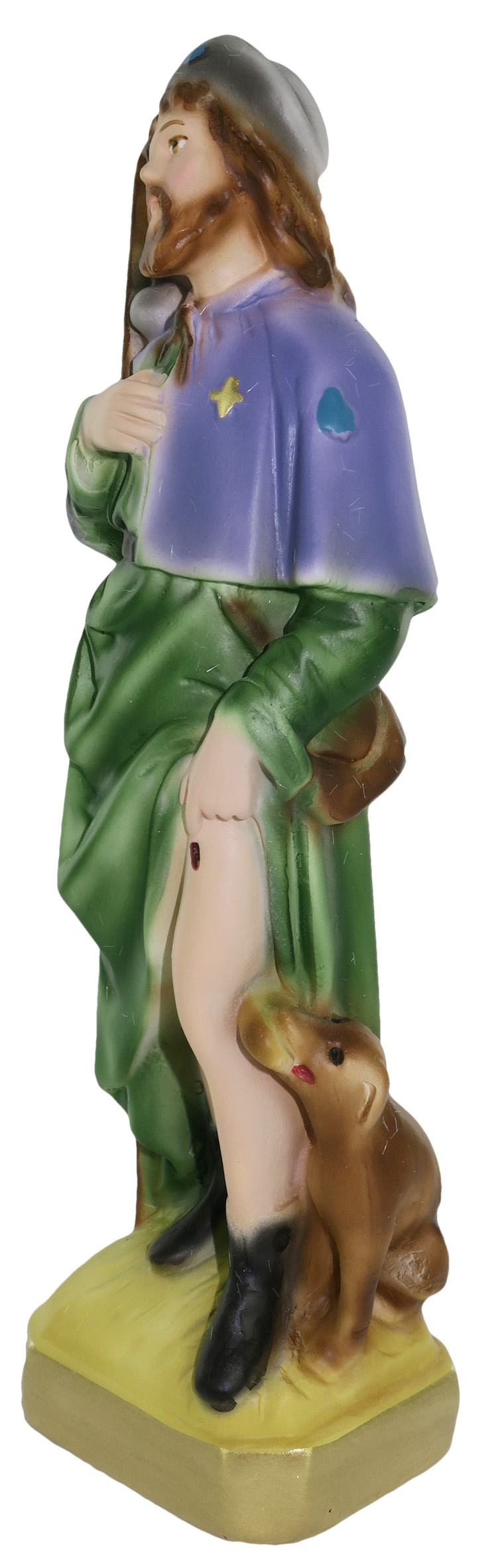 La statua, in gesso finemente dipinto a mano, raffigura San Rocco, pellegrino, terziario francescano e taumaturgo. Diventato conosciuto nella comunità cristiana per le sue opere di assistenza ai malati di peste durante il suo peregrinare verso Roma, viene spesso invocato come protettore contro le calamità naturali e le malattie degli animali. Il santo, ricordato il 16 agosto, è patrono di malati infettivi, invalidi e prigionieri. Qui rappresentato su un piedistallo color oro e giallo, S. Rocco regge un bastone da viandante, indossa un grembiule verde e condivide la scena con alcuni dei simboli che lo identificano: il cane e l'emblema del pellegrino sul suo coprispalle. Il santo mostra anche una piaga sulla gamba, che ricorda la malattia che, durante la sua devota vita, si è dedicato a debellare nelle persone che incontrava lungo il suo percorso.