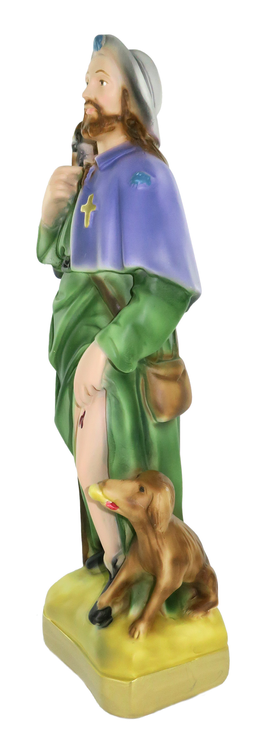 La statua, in gesso finemente dipinto a mano, raffigura San Rocco, pellegrino, terziario francescano e taumaturgo. Diventato conosciuto nella comunità cristiana per le sue opere di assistenza ai malati di peste durante il suo peregrinare verso Roma, viene spesso invocato come protettore contro le calamità naturali e le malattie degli animali. Il santo, ricordato il 16 agosto, è patrono di malati infettivi, invalidi e prigionieri. Qui rappresentato su un piedistallo color oro e giallo, S. Rocco regge un bastone da viandante, indossa un grembiule verde e condivide la scena con alcuni dei simboli che lo identificano: il cane e l'emblema del pellegrino sul suo coprispalle. Il santo mostra anche una piaga sulla gamba, che ricorda la malattia che, durante la sua devota vita, si è dedicato a debellare nelle persone che incontrava lungo il suo percorso.