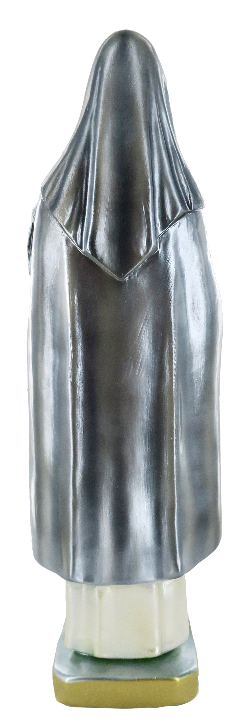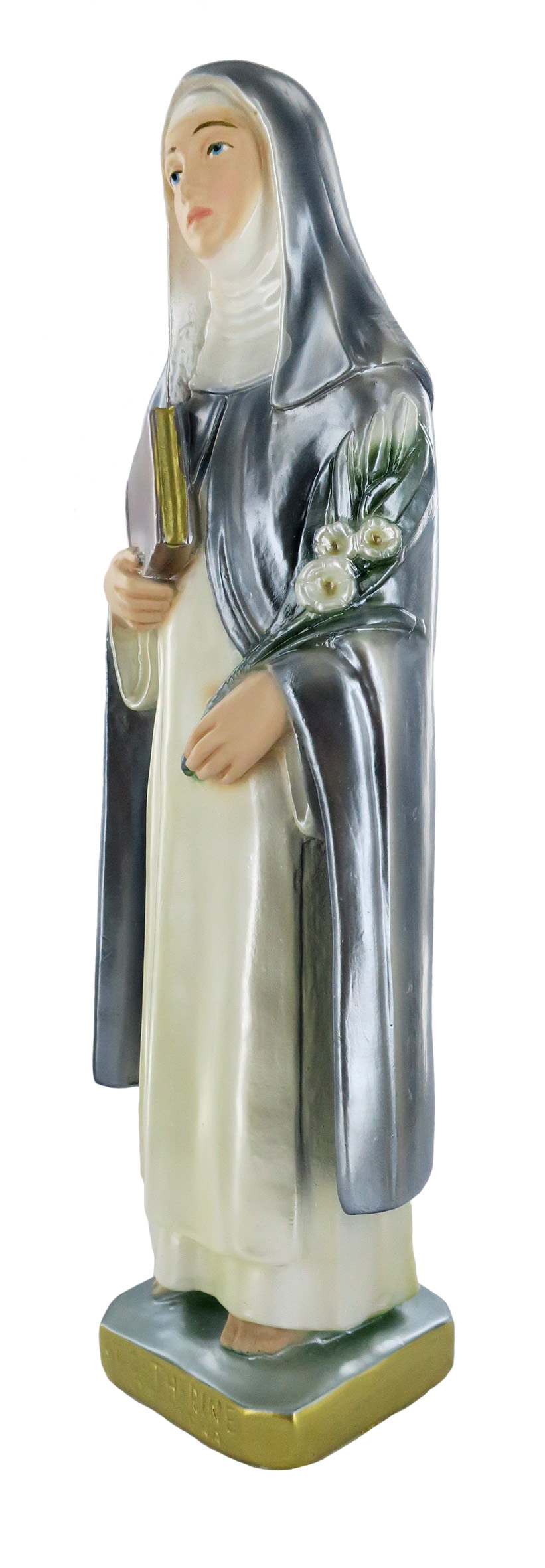 Questa statua di S. Caterina da circa 30 cm è realizzata artigianalmente in Italia e si distingue per la qualità della fattura e per il sapiente uso dei colori. L'effetto madreperlato rende le tinte molto lucenti e arricchisce la figura di suggestivi riflessi, donandole un aspetto elegante e raffinato.