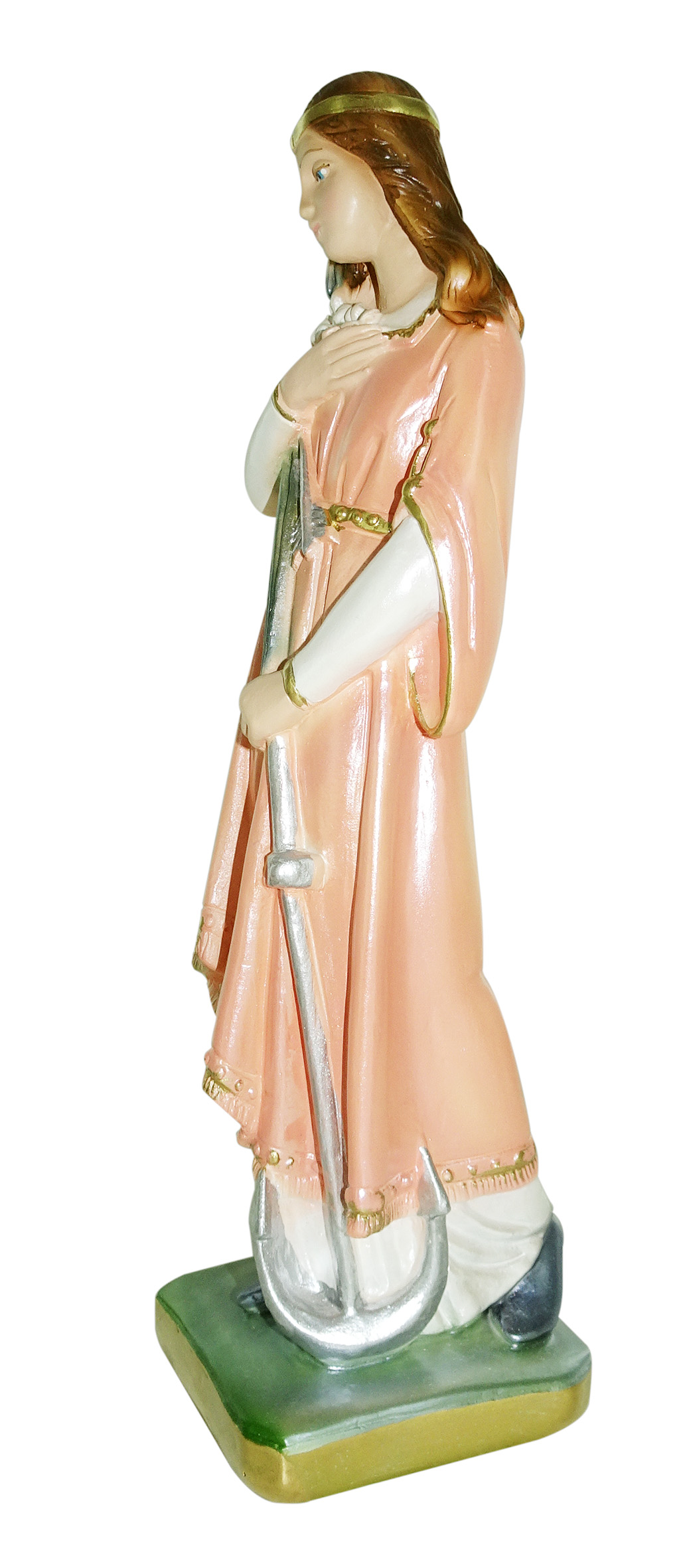 Questa statua di S. Filomena da circa 20 cm d'altezza è realizzata artigianalmente in Italia e si distingue per la qualità della fattura e per il sapiente uso dei colori. L'effetto madreperlato rende le tinte molto lucenti e arricchisce la figura di suggestivi riflessi, donandole un aspetto elegante e raffinato.