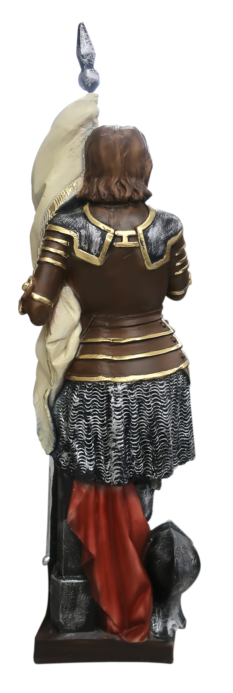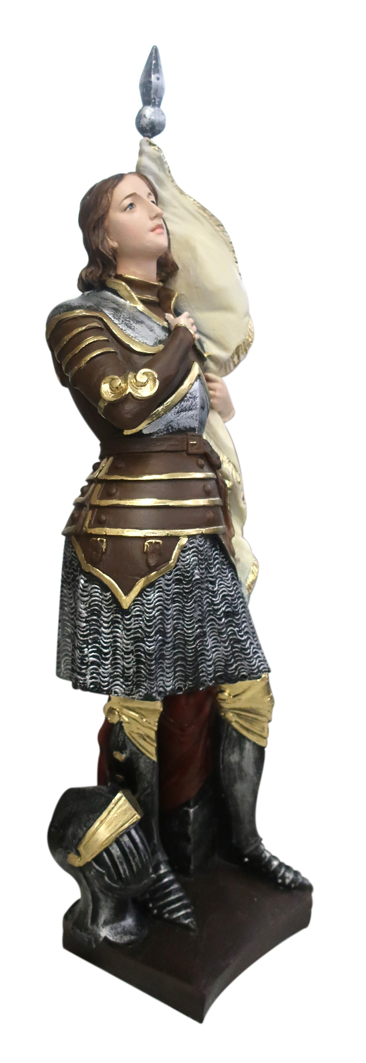 La statua, in resina finemente dipinta a mano, raffigura Santa Giovanna d'Arco, personaggio di origini molto semplici, distintosi per coraggio e ardore cristiano. Proclamata santa da Benedetto XV nel 1920, in gioventù seguì voci misteriose, secondo cui le fu attribuita la missione di liberare il suo Paese, la Francia, dagli Inglesi. Senza appoggi da parte del re, fu prima catturata, per poi essere condannata e arsa viva per eresia. Suo simbolo è la spada.