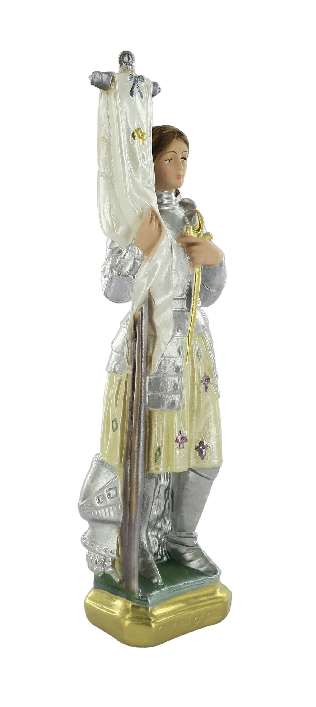 La statua, in gesso finemente dipinto a mano e impreziosito da una rifinitura madreperlata, raffigura Santa Giovanna d'Arco, personaggio di origini molto semplici, distintosi per coraggio e ardore cristiano. Proclamata santa da Benedetto XV nel 1920, in gioventù seguì voci misteriose, secondo cui le fu attribuita la missione di liberare il suo Paese, la Francia, dagli Inglesi. Senza appoggi da parte del re, fu prima catturata, per poi essere condannata e arsa viva per eresia. Suo simbolo è la spada, raffigurata in questa statuetta insieme all'armatura e a uno stendardo bellico.