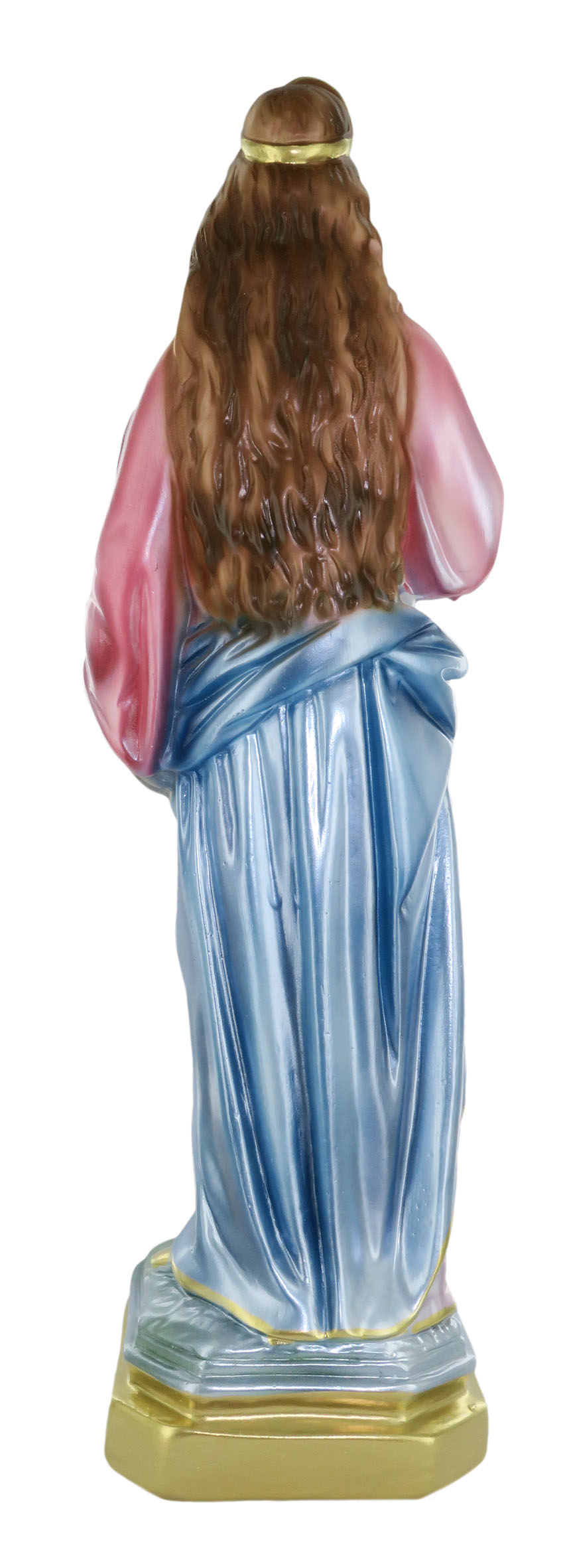 Questa statua di S. Lucia da 40 cm è realizzata artigianalmente in Italia e si distingue per la qualità della fattura e per il sapiente uso dei colori, adeguatamente dosati. L'effetto madreperlato rende le tinte molto lucenti e arricchisce la figura di suggestivi riflessi, donandole un aspetto elegante e pregevole. Adatta a nicchie in ambienti dedicati al culto, la statua di Santa Lucia risulterà ancora più bella se illuminata dalla luce di lumini o di faretti, che esalterà l'effetto iridescente della sua rifinitura madreperlacea.