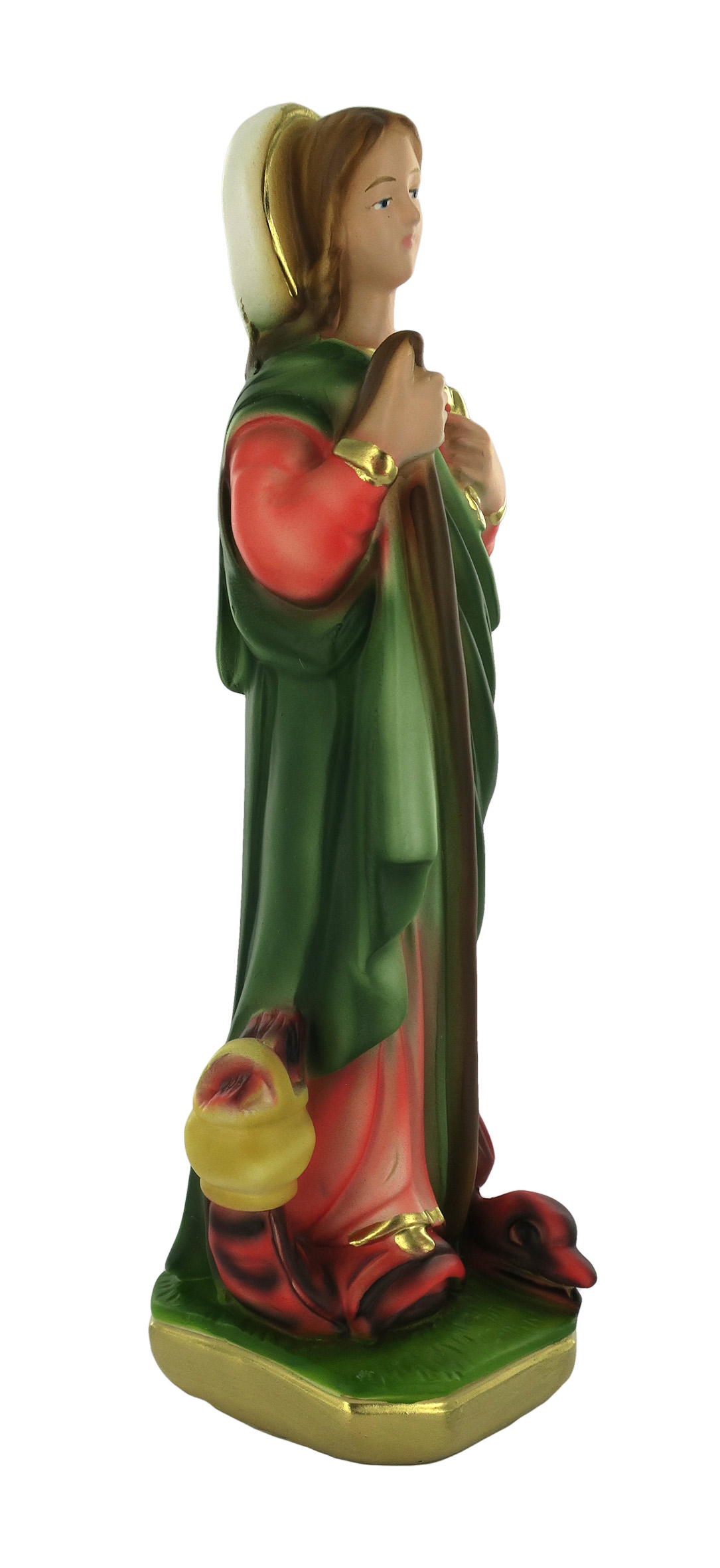 Questa statua di Santa Marta da circa 20 cm è realizzata artigianalmente in Italia e si distingue per la qualità della fattura e per il sapiente uso dei colori, adeguatamente dosati. L'effetto madreperlato rende le tinte molto lucenti e arricchisce la figura di suggestivi riflessi, donandole un aspetto elegante e pregevole. La statuetta di S. Marta, adatta anche a piccole nicchie in ambienti dedicati al culto, è ideale per essere esposta in casa come soprammobile o in una vetrinetta. Sarà una gradita idea regalo per i devoti a questo personaggio. La luce delle fiammelle dei lumini o dei faretti esalterà l'effetto iridescente della sua rifinitura madreperlacea.