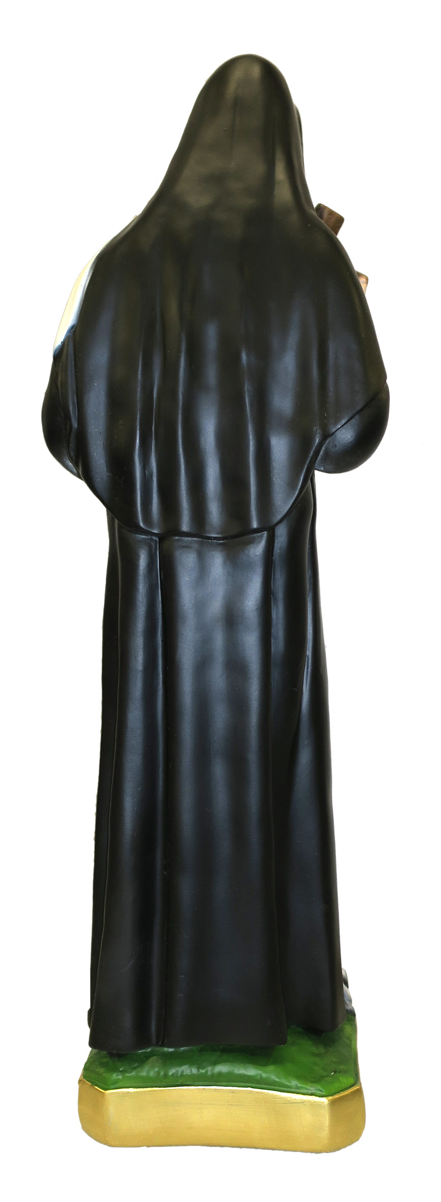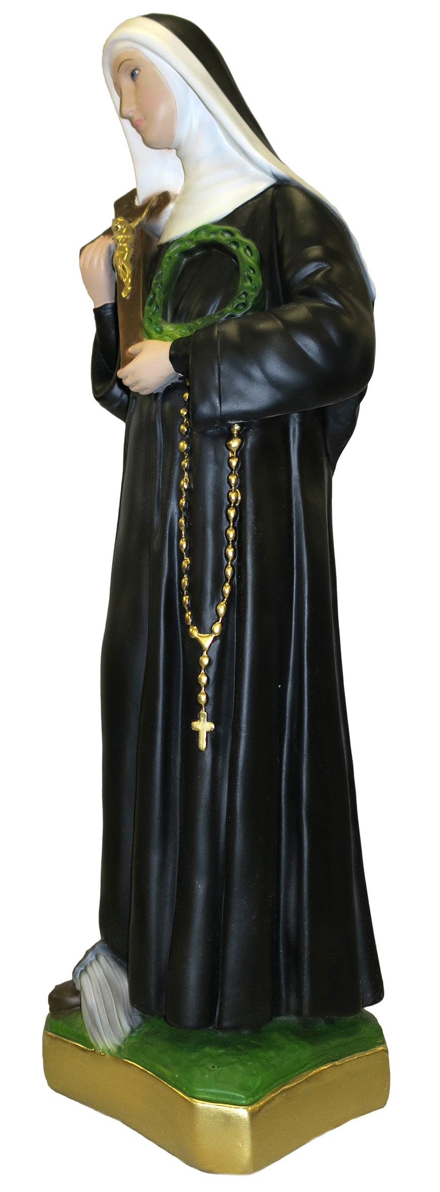 La statua, in gesso finemente dipinto a mano, raffigura Santa Rita, una delle figure più importanti, molto cara ai cattolici. Conosciuta semplicemente anche come "Rita da Cascia", è stata proclamata santa da papa Leone XIII nel 1900. Rimasta vedova, decise di prendere i voti ed entrare nel monastero agostiniano di Santa Maria Maddalena, a Cascia. Dopo aver ricevuto in fronte una spina della corona del crocifisso, ne porterà a vita il segno sottoforma di stigmate. Da qui deriva l'iconografia che spesso la associa alle api, alle rose e, appunto, alla spina. Qui è rappresentata con una corona di spine e un crocifisso in mano, di color oro e marrone. Il copricapo bianco spicca sul nero della veste.