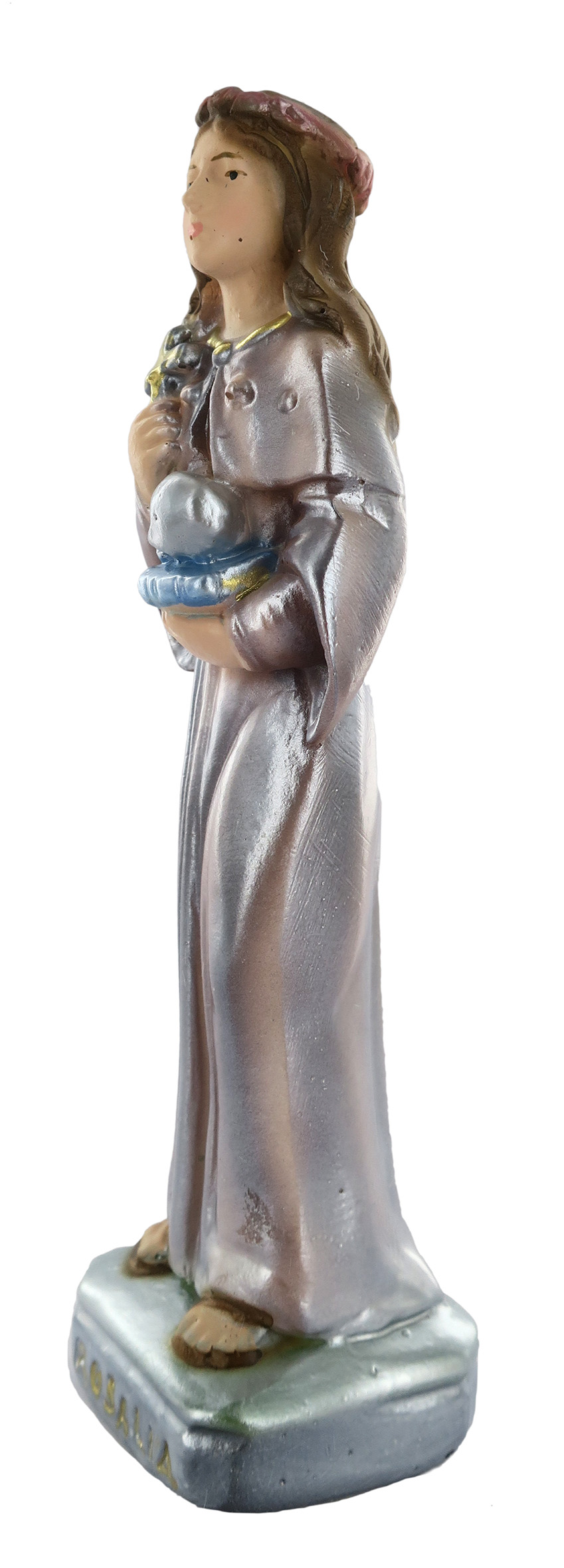 La statua, in gesso finemente dipinto a mano e impreziosita da una rifinitura madreperlata, raffigura Santa Rosalia, santa vergine eremita siciliana del XII secolo conosciuta anche come "La Santuzza". In questa rappresentazione, indossa una veste grigia dal colore quasi metallico, con un crocifisso in una mano, mentre con l'altra regge un libro e un teschio senza mandibola, suo simbolo. Fa parte della simbologia a lei ricondotta anche la corona di rose, da lei indossata in questa statuetta. È la santa patrona della sua città natale, Palermo.
