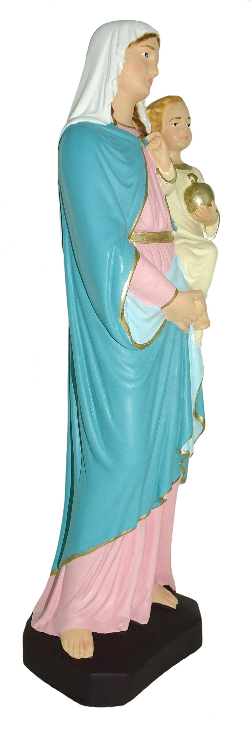 La statua, in materiale infrangibile tipo gomma, raffigura la Madonna con Bambino ed è dipinta a mano. Grazie al materiale di cui è fatta e alla resistenza che la caratterizza, è adatta all'uso esterno, come in giardini e nicchie all'aperto. Può essere esposta anche alla pioggia. La rappresentazione fa riferimento ad uno dei soggetti più rappresentati nell'arte sacra: la Vergine con il Bambino, simbolo di maternità e del forte legame tra madre e figlio.