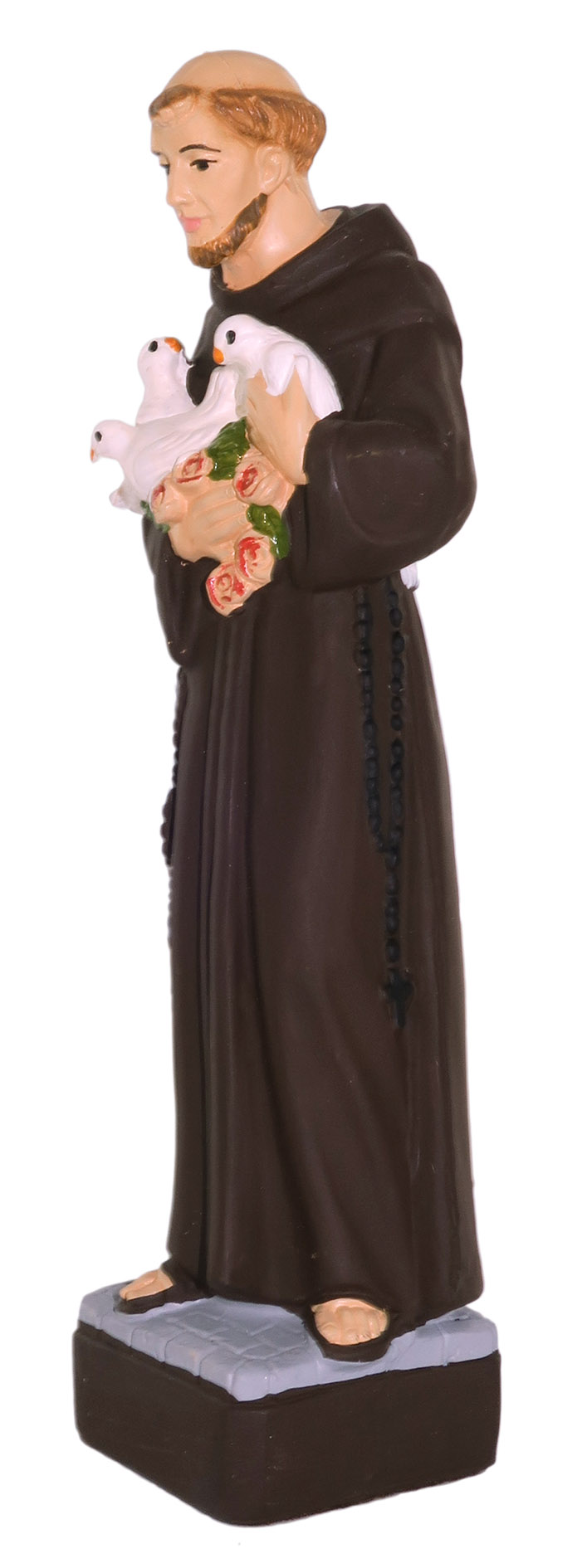 La statua, in materiale infrangibile tipo gomma, raffigura San Francesco d'Assisi ed è dipinta a mano. Grazie al materiale di cui è fatta e alla resistenza che la caratterizza, è adatta all'uso esterno, come giardini e nicchie all'aperto. Può essere esposta anche alla pioggia.