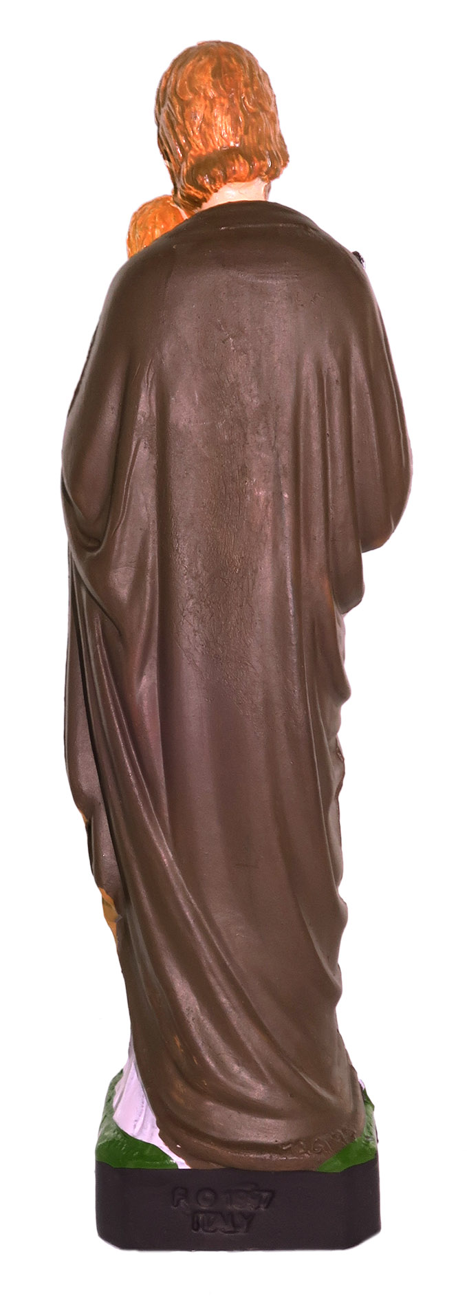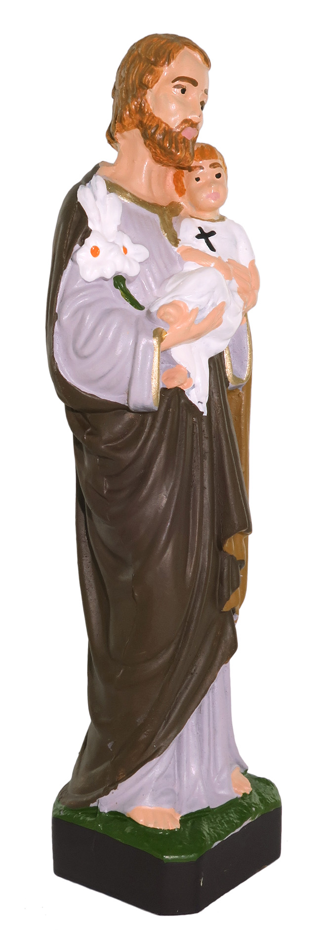 La statua, in materiale infrangibile tipo gomma, raffigura San Giuseppe ed è dipinta a mano. Grazie al materiale di cui è fatta e alla resistenza che la caratterizza, è adatta all'uso esterno, come giardini e nicchie all'aperto. Può essere esposta anche alla pioggia. Il soggetto è una delle personalità più importanti della Cristianità, il padre terreno di Gesù Cristo, qui rappresentato con il Bambino in braccio e i suoi fiori simbolo, i gigli.