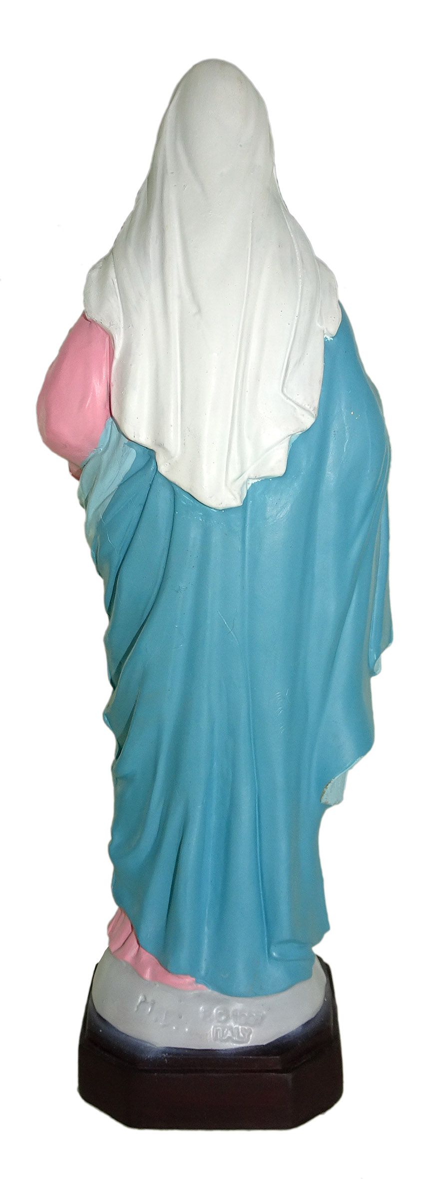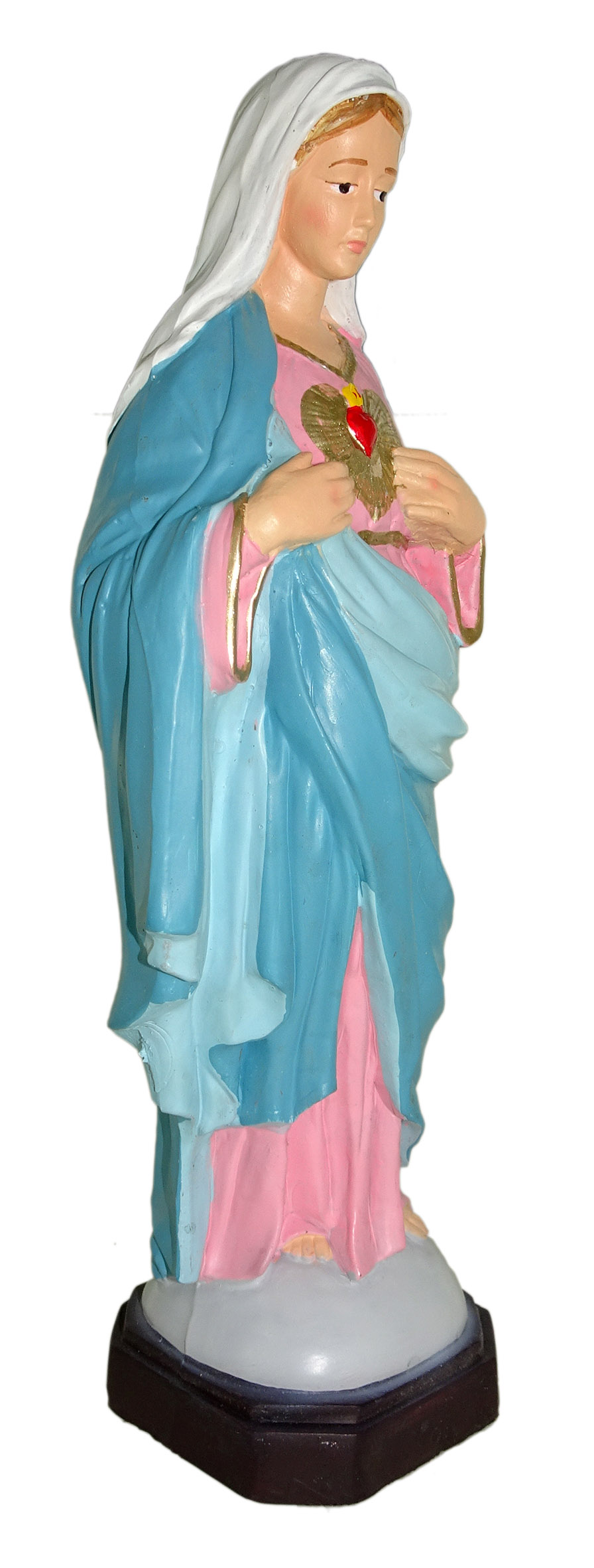 La statua, in materiale infrangibile tipo gomma, raffigura il Sacro Cuore di Maria ed è dipinta a mano. Grazie al materiale di cui è fatta e alla resistenza che la caratterizza, è adatta all'uso esterno, come in giardini e nicchie all'aperto. Può essere esposta anche alla pioggia. La rappresentazione fa riferimento ad una delle venerazioni più care ai devoti cattolici: il cuore della Santa Madre, chiamato anche “Cuore Immacolato di Maria”, simboleggia il dolore provato per la morte del figlio.
