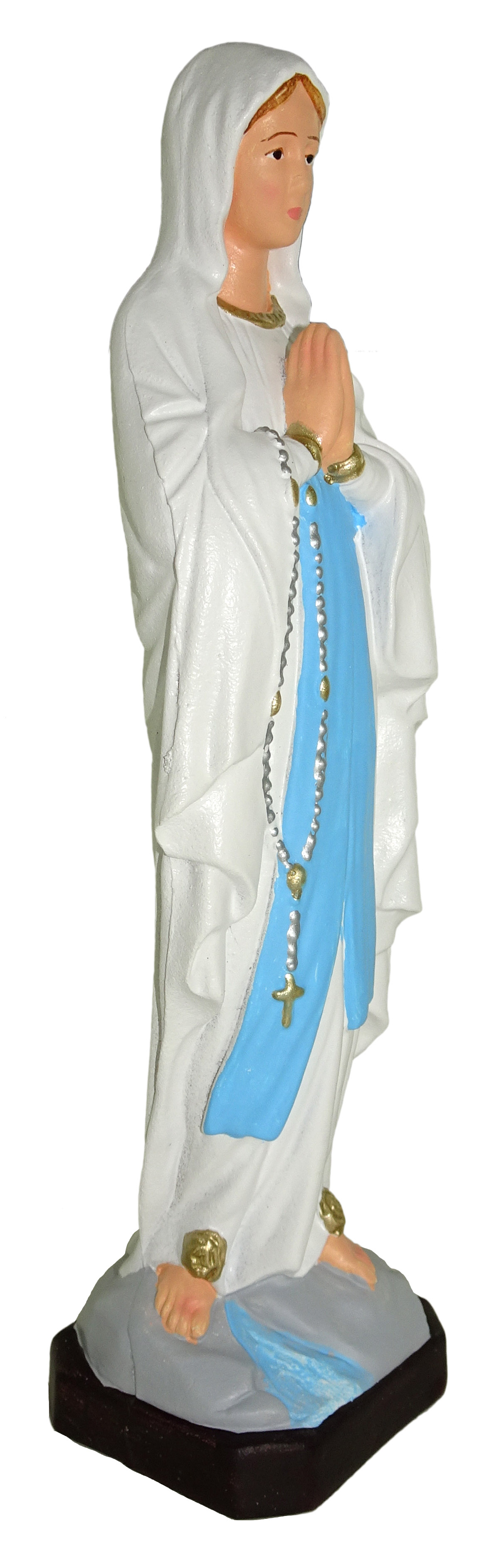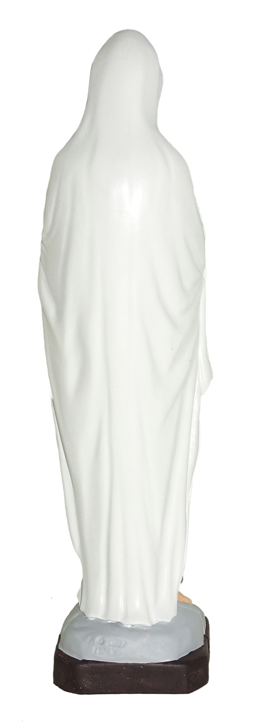 La statua, in materiale infrangibile tipo gomma, raffigura la Madonna Madonna di Lourdes ed è dipinta a mano. Grazie al materiale di cui è fatta e alla resistenza che la caratterizza, è adatta all'uso esterno, come in giardini e nicchie all'aperto. Può essere esposta anche alla pioggia.