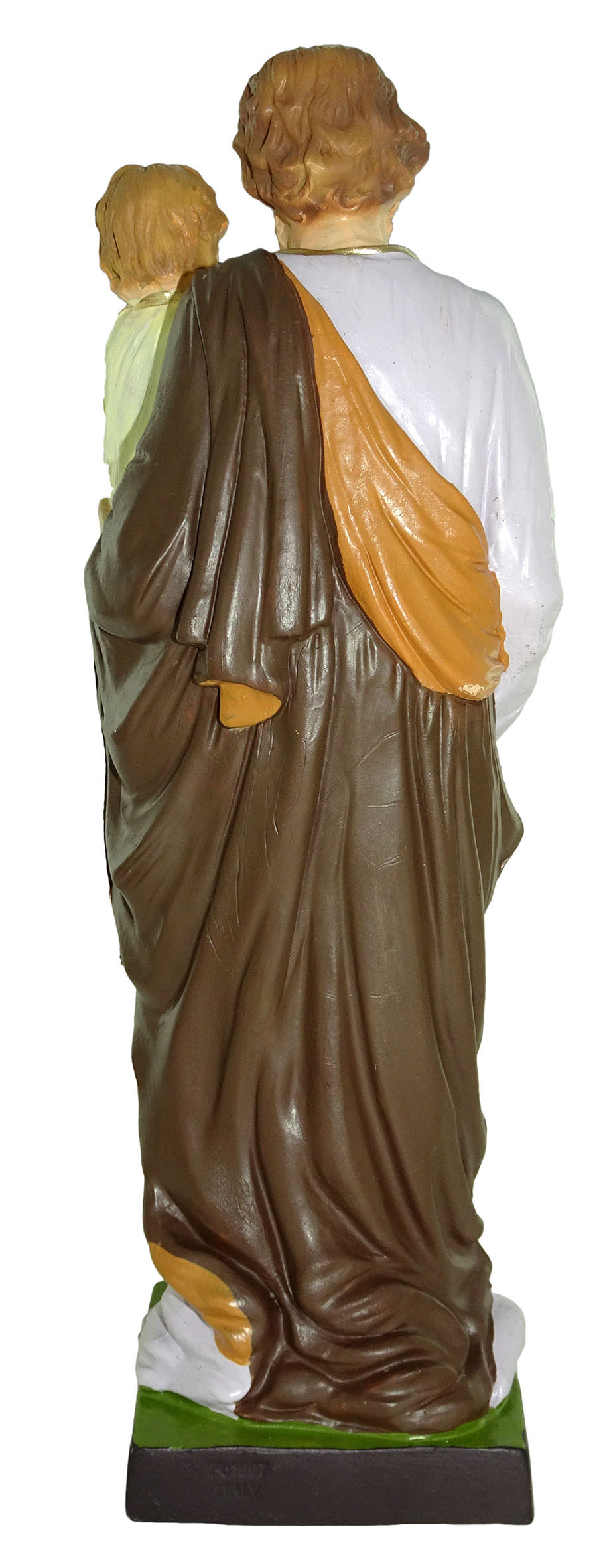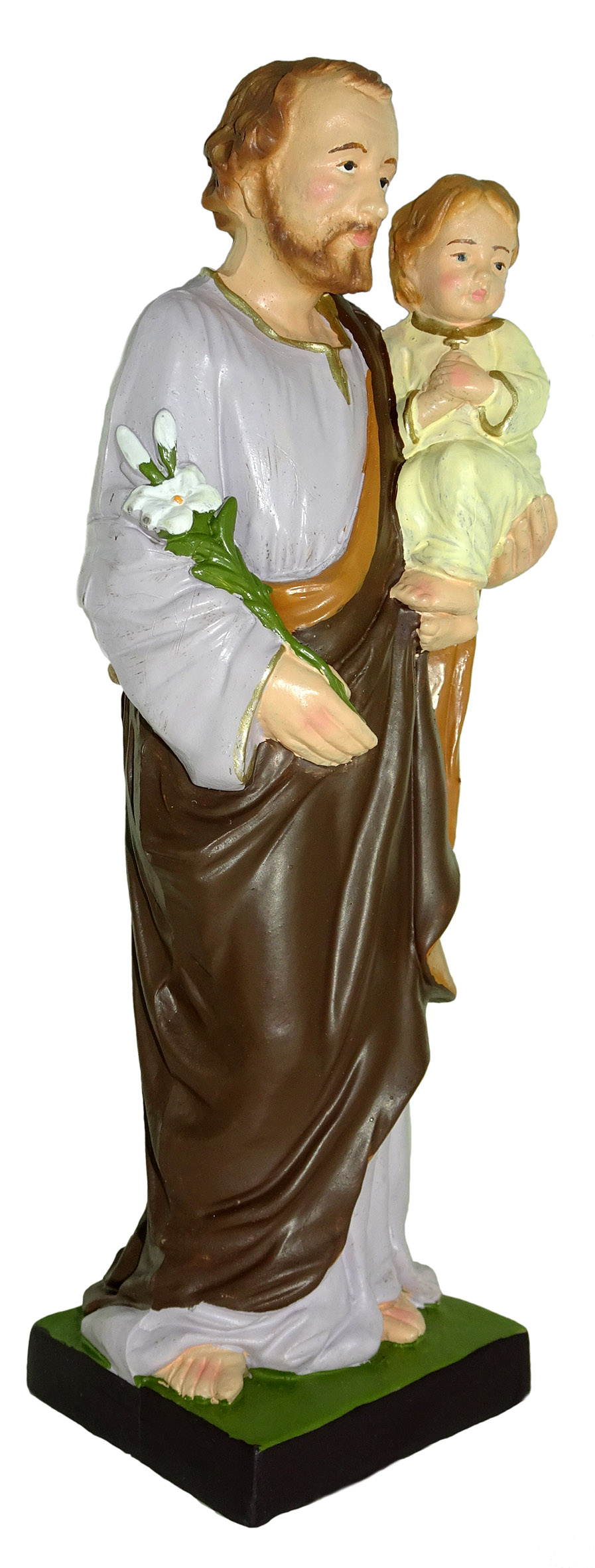 La statua, in materiale infrangibile tipo gomma, raffigura San Giuseppe ed è dipinta a mano. Grazie al materiale di cui è fatta e alla resistenza che la caratterizza, è adatta all'uso esterno, come giardini e nicchie all'aperto. Può essere esposta anche alla pioggia. Il soggetto è una delle personalità più importanti della Cristianità, il padre terreno di Gesù Cristo, qui rappresentato con il Bambino in braccio e i suoi fiori simbolo, i gigli.
