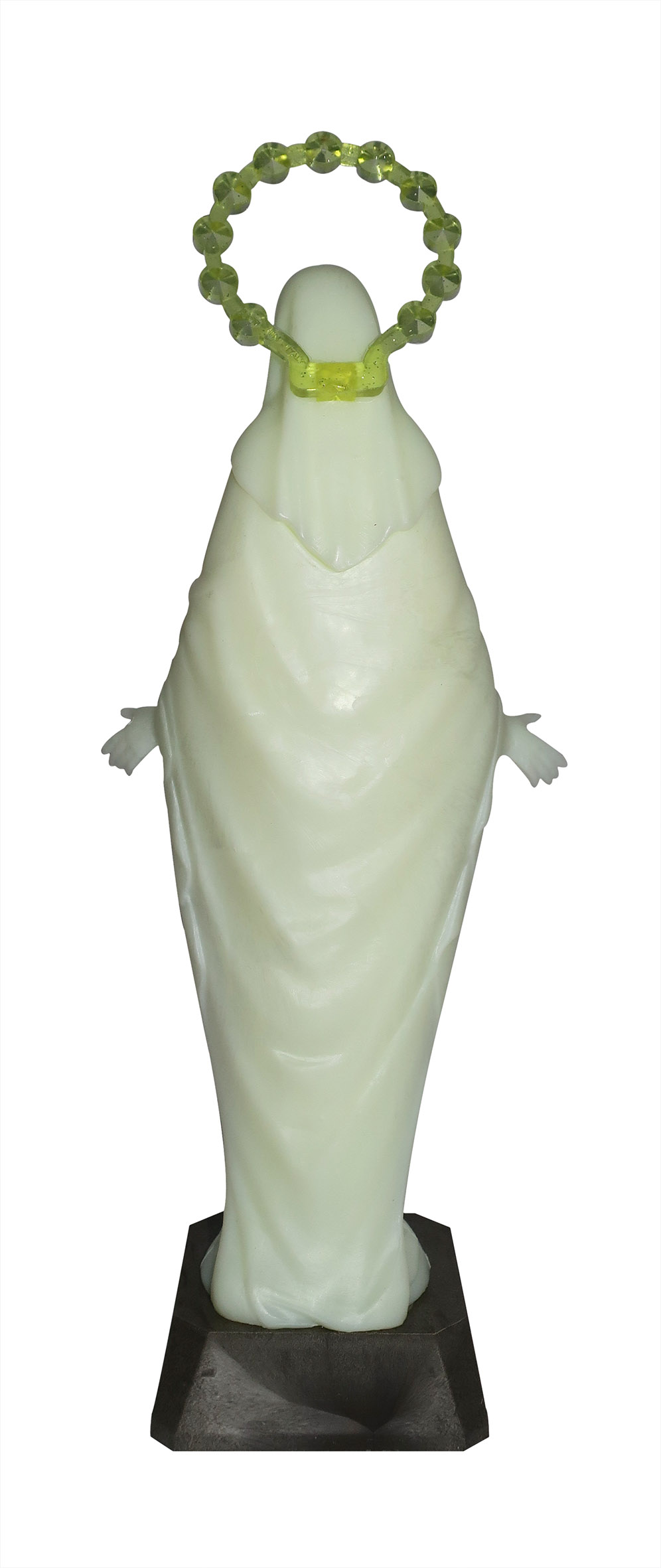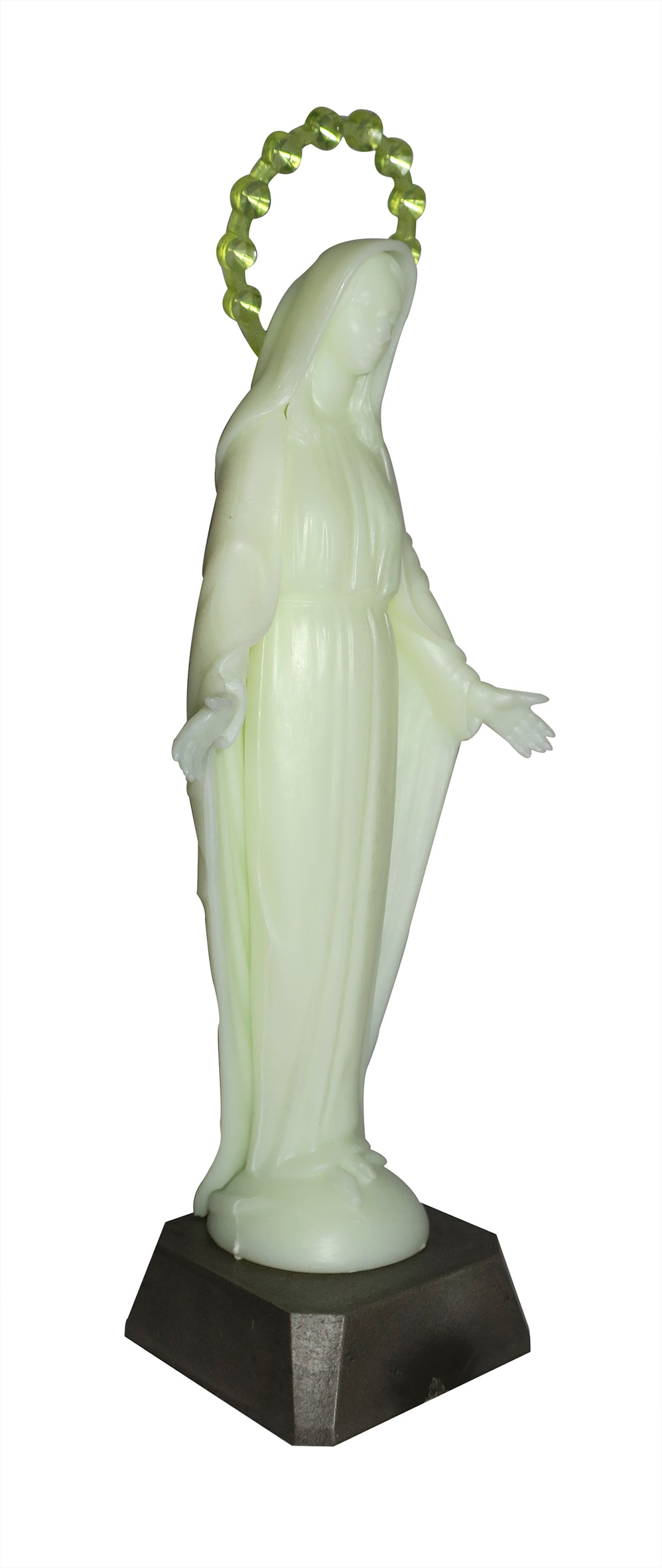Statua della Madonna Miracolosa realizzata in plastica fosforescente. La statua misura 20 cm ed è incollata su piedistallo di 2 cm. L'aureola è removibile.