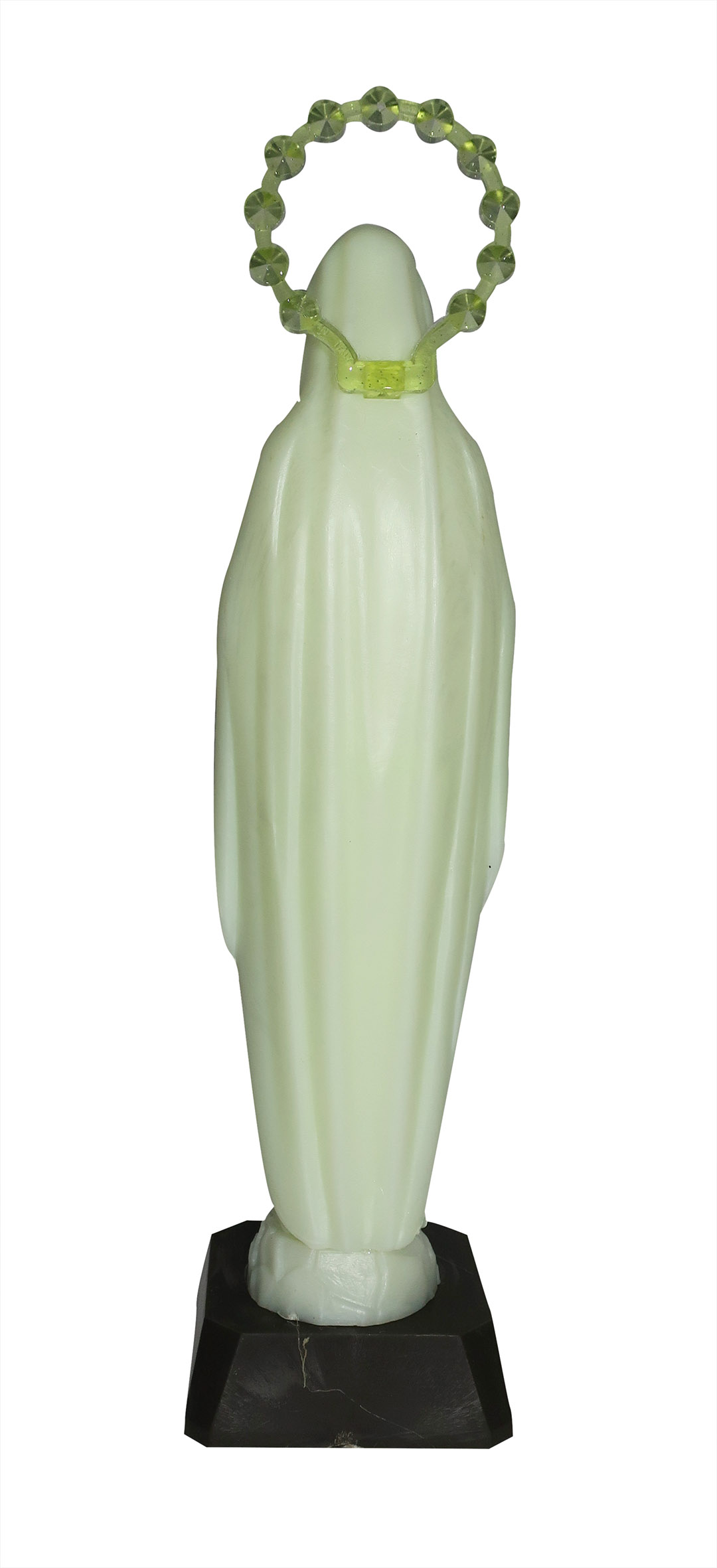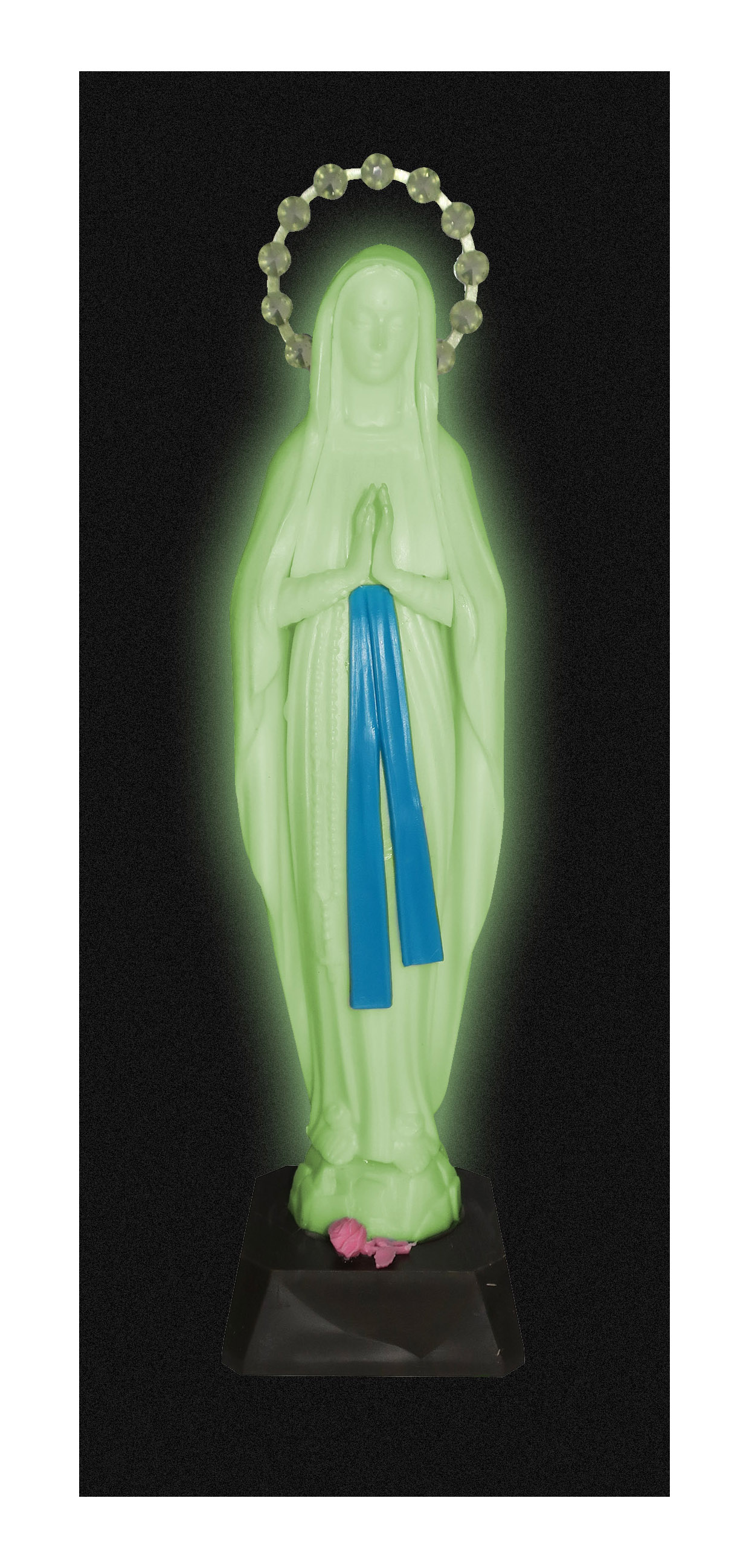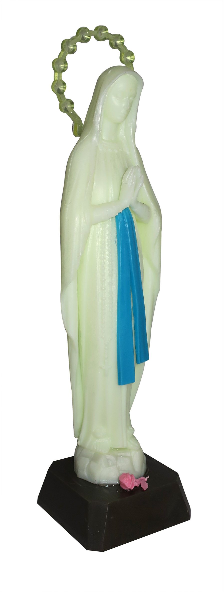 Statua della Madonna di Lourdes realizzata in plastica fosforescente. La statua misura 20 cm ed è incollata su piedistallo di 2 cm. La aureola è removibile.