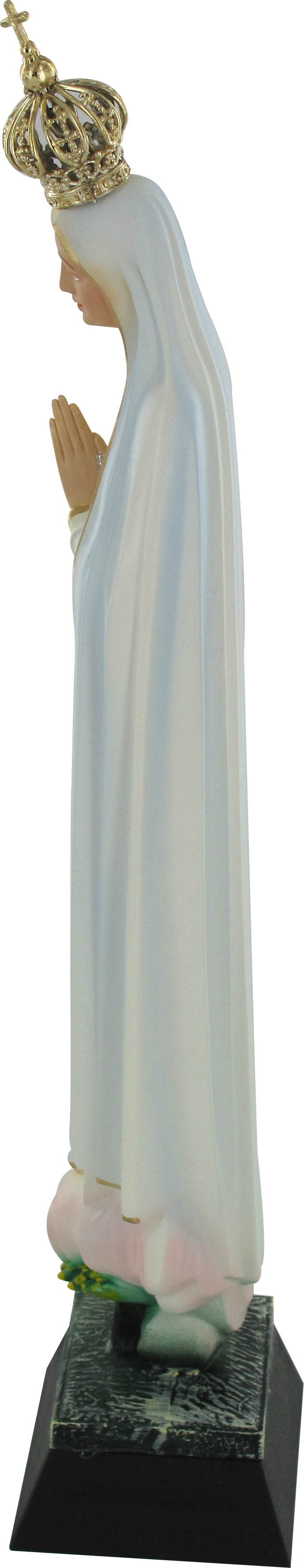 Questa statua della Vergine di Fatima di circa 27 cm d'altezza è prodotta a Fatima, in Portogallo, è realizzata in poliestere ed è dipinta a mano. Il volto della Vergine è molto delicato e la donna ha le mani conserte, in segno di preghiera. I suoi abiti sono abbelliti da bordi in color oro, ricche di pieghe e sfumature molto tenui di color giallo e azzurro. Sul capo, la Vergine di Fatima porta una corona metallica di color oro che contribuisce a far risaltare ulteriormente il suo volto. Lungo il vestito, si nota il rosario di color argento, ben realizzato, elemento classico di questa raffigurazione mariana. La nuvola su cui poggia vanta sfumature molto delicate di color rosa.