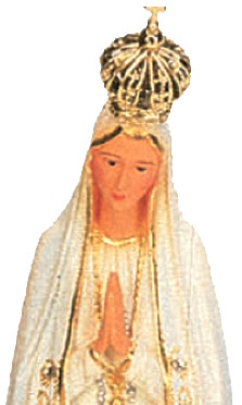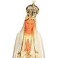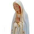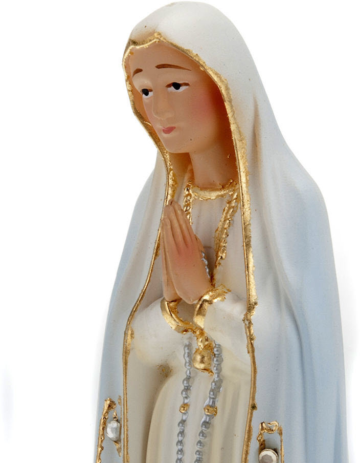 Questa statua della Vergine di Fatima di circa 22 cm d'altezza è prodotta a Fatima, in Portogallo, è realizzata in poliestere ed è dipinta a mano. Il volto della Vergine, qui rappresentata con le mani giunte in preghiera, è molto delicato. I suoi abiti sono abbelliti da bordi e decori in color oro, pieghe e sfumature molto tenui di color giallo e azzurro, e da strass verdi. Sul capo, la Vergine di Fatima porta una corona metallica di color oro che contribuisce a far risaltare ulteriormente il suo volto. Lungo il vestito, si nota il rosario di color argento, ben realizzato, elemento classico di questa raffigurazione mariana. La nuvola su cui poggia vanta sfumature molto delicate di color rosa.