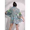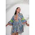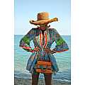 Caftano corto in cotone, fantasia “Papeete”; inserti in pizzo macramé sulle maniche, giochi di frange e passamanerie su scollo e fondo maniche.