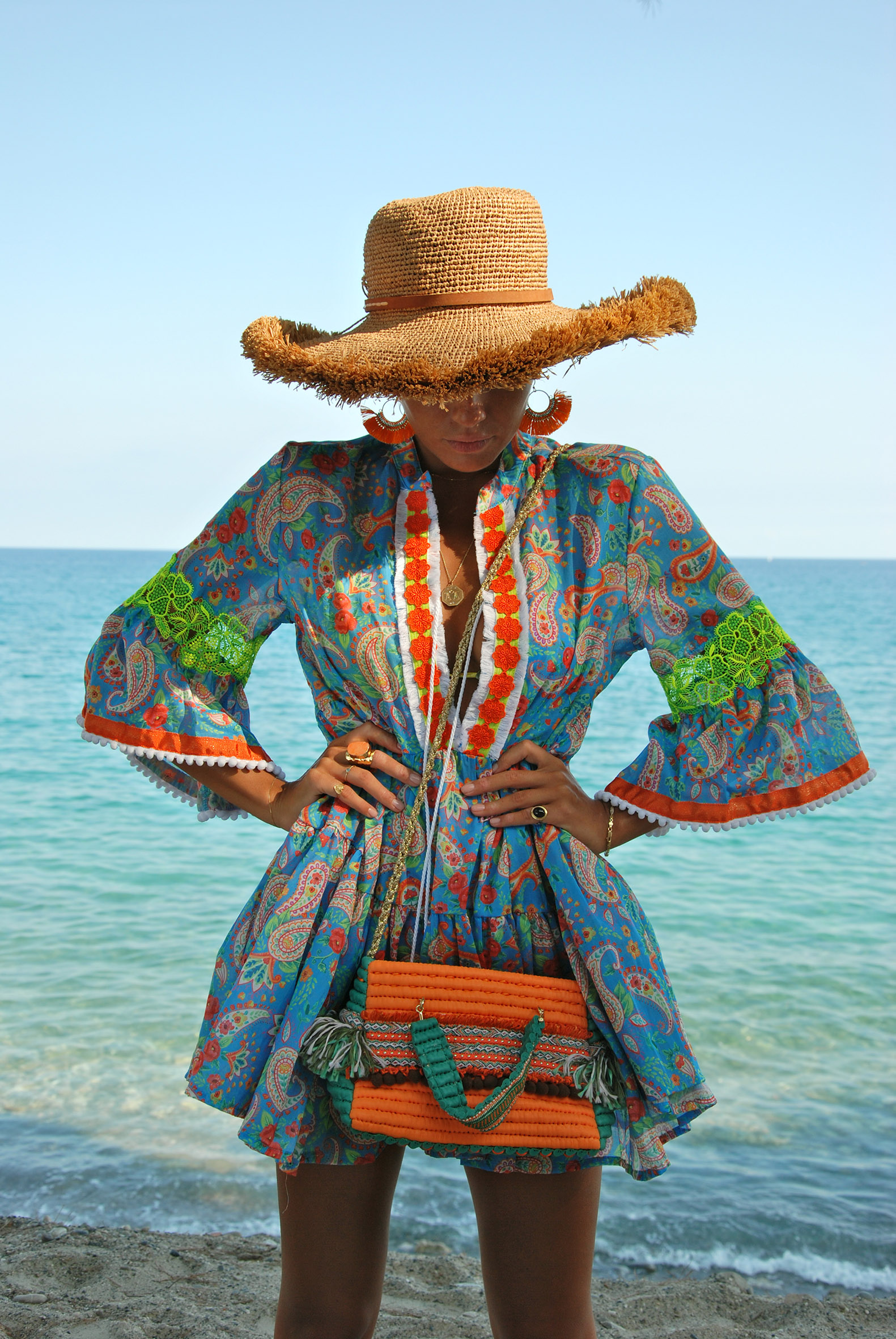 Caftano corto in cotone, fantasia “Papeete”; inserti in pizzo macramé sulle maniche, giochi di frange e passamanerie su scollo e fondo maniche.
