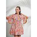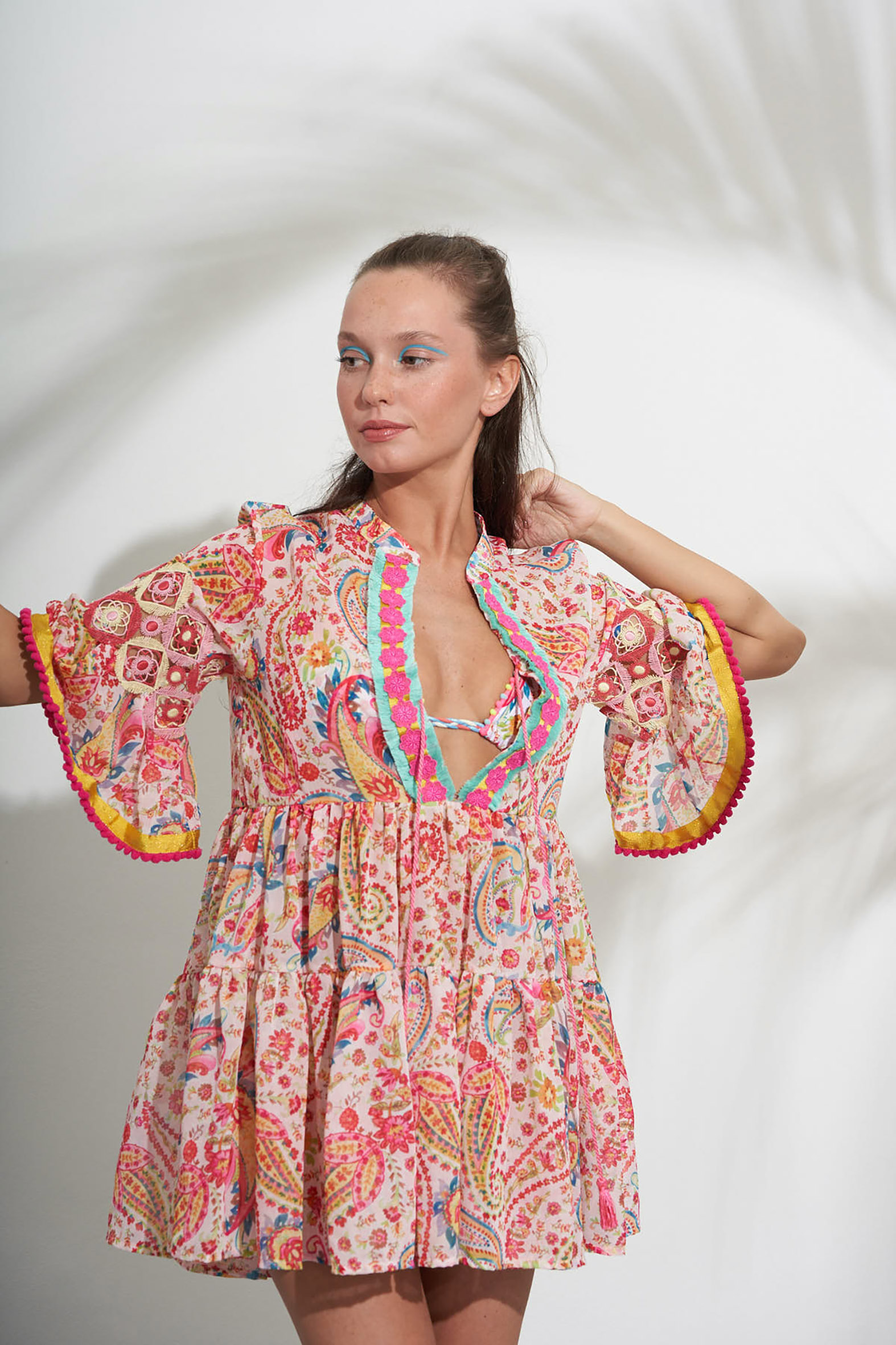 Caftano corto in cotone, fantasia “Papua”; inserti in pizzo macramé sulle maniche, giochi di frange e passamanerie su scollo e fondo maniche.