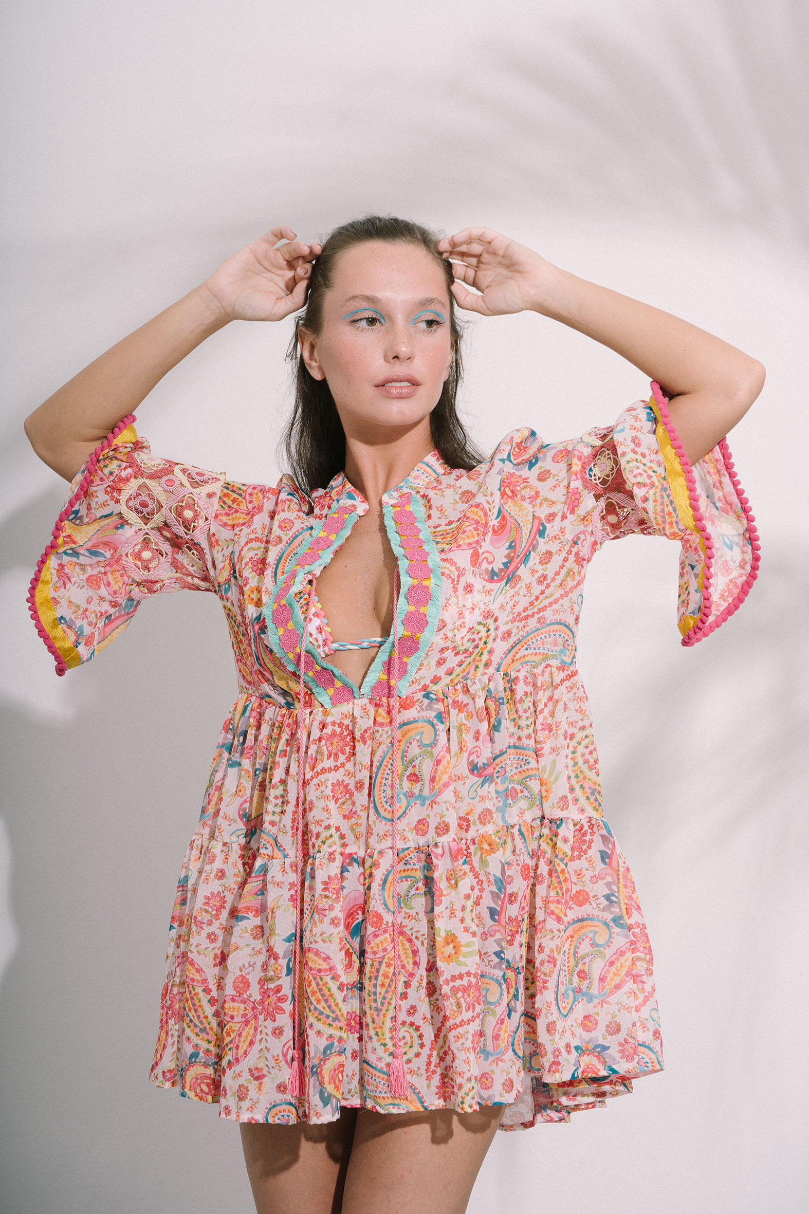 Caftano corto in cotone, fantasia “Papua”; inserti in pizzo macramé sulle maniche, giochi di frange e passamanerie su scollo e fondo maniche.