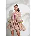 Caftano corto in cotone, fantasia “Secret Garden”; inserti in pizzo macramé sulle maniche, giochi di frange e passamanerie su scollo e fondo maniche.