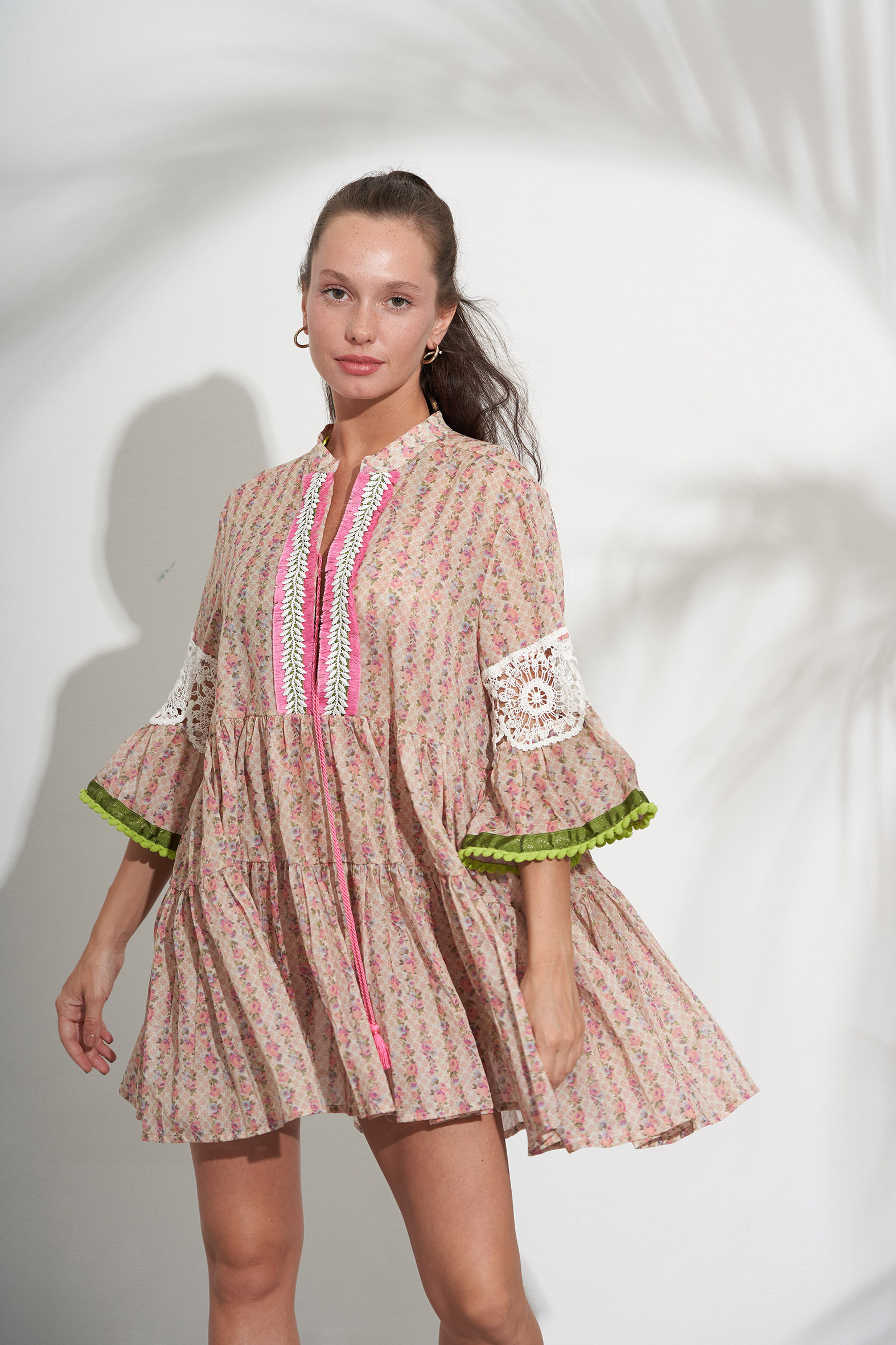 Caftano corto in cotone, fantasia “Secret Garden”; inserti in pizzo macramé sulle maniche, giochi di frange e passamanerie su scollo e fondo maniche.