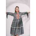 Caftano lungo in voile di cotone, fantasia “Jakarta”; maniche con allacciatura a fiocco; giochi di frange, passamanerie, fiore crochet fatto a mano e pom-pom sullo scollo; nastro decorativo tra le balze.
