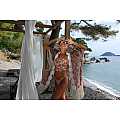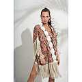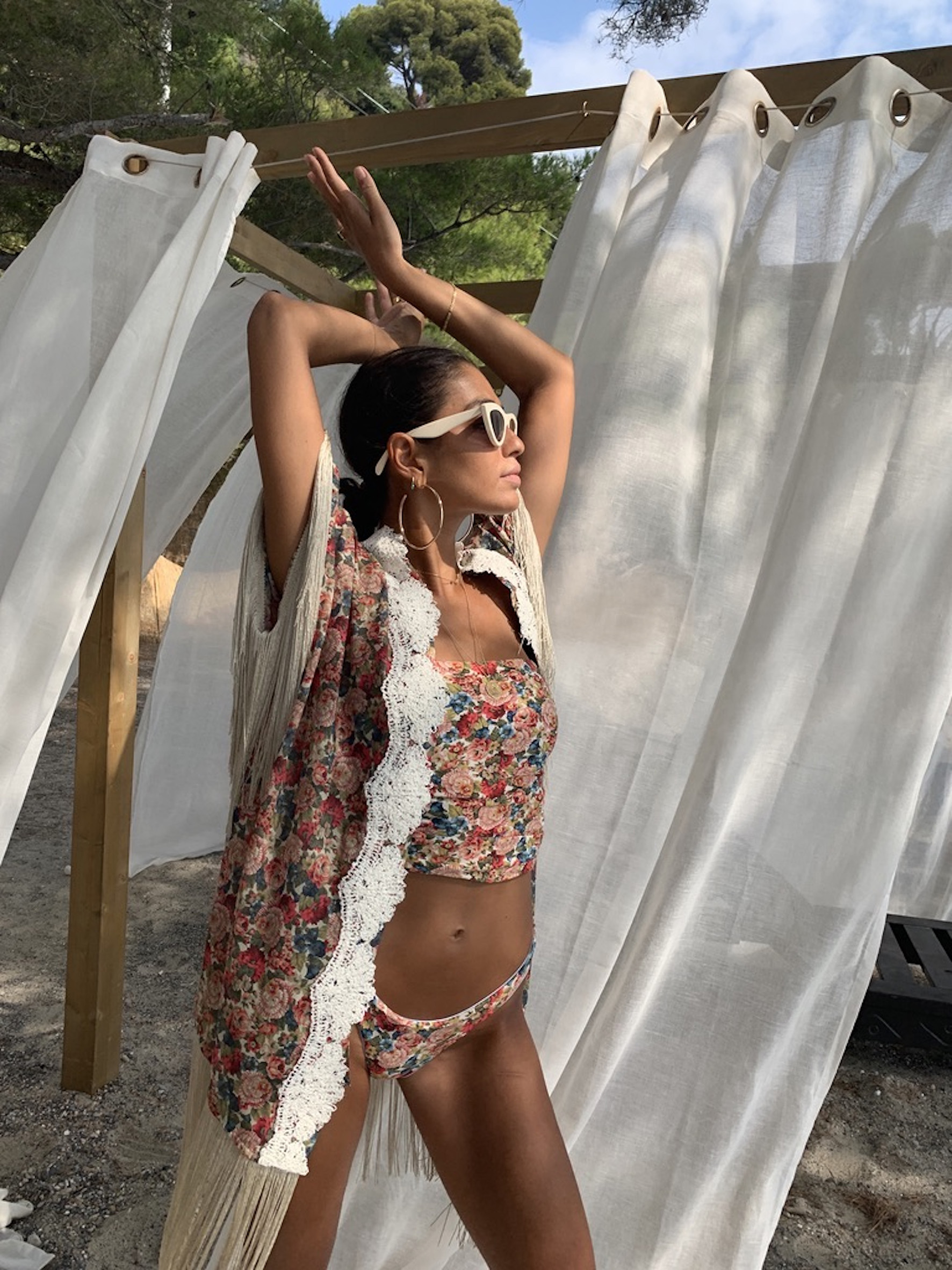 Kimono in voile di cotone, fantasia “Eden”; lunga frangia su maniche e finale abito; lacci di chiusura interni, bordatura con raffinato nastro macramé.