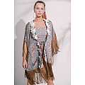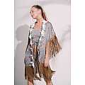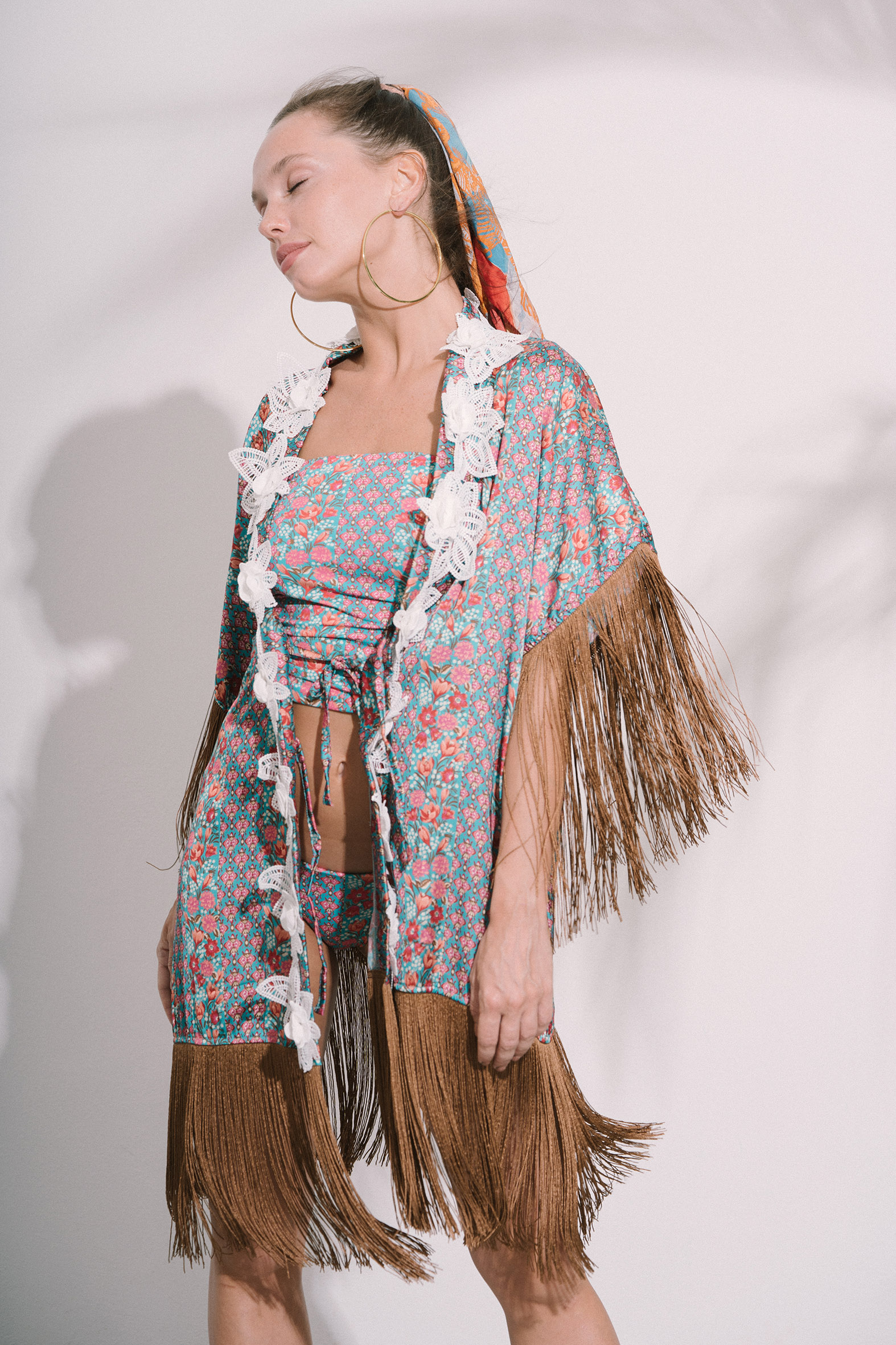Kimono in raso, fantasia “Jakarta”; lunga frangia su maniche e finale abito; lacci di chiusura interni, bordatura con raffinato nastro macramé floreale.