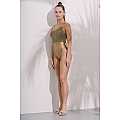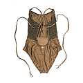 Costume intero in lurex e lamina bronzo; lacci a treccia fatta a mano; allacciatura al collo o sulla schiena.