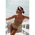 Costume intero in lurex e lamina bronzo; lacci a treccia fatta a mano; allacciatura al collo o sulla schiena.