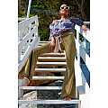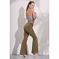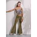 Pantalone a zampa d’elefante in lurex bronzo; elastico morbido in vita, fusciacca bi-color bronzo e carne.