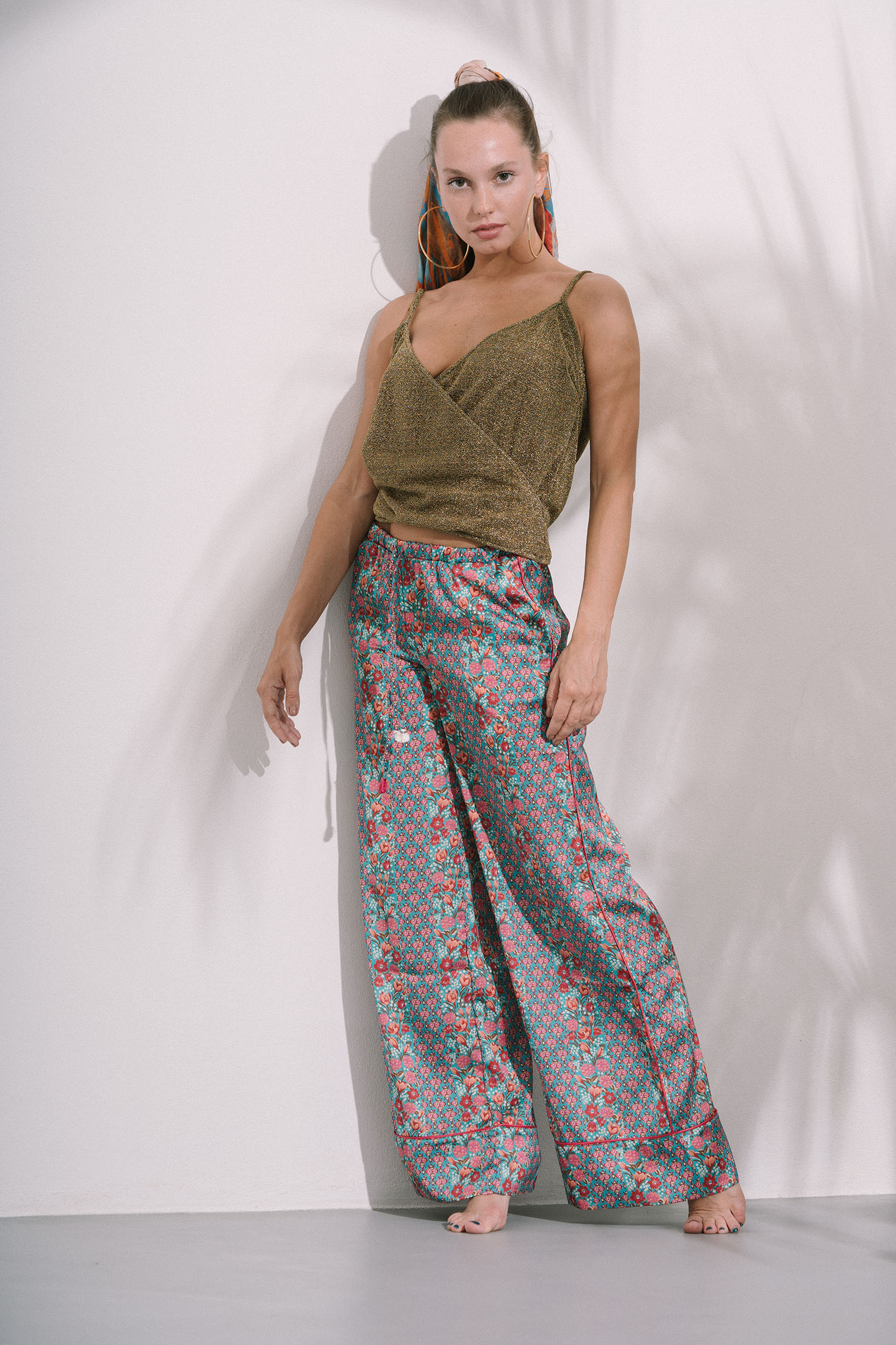Pantalone Palazzo in raso, fantasia “Jakarta”; elastico morbido in vita con coulisse; lacci con nappine colorate sui finali; tasche laterali.