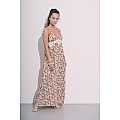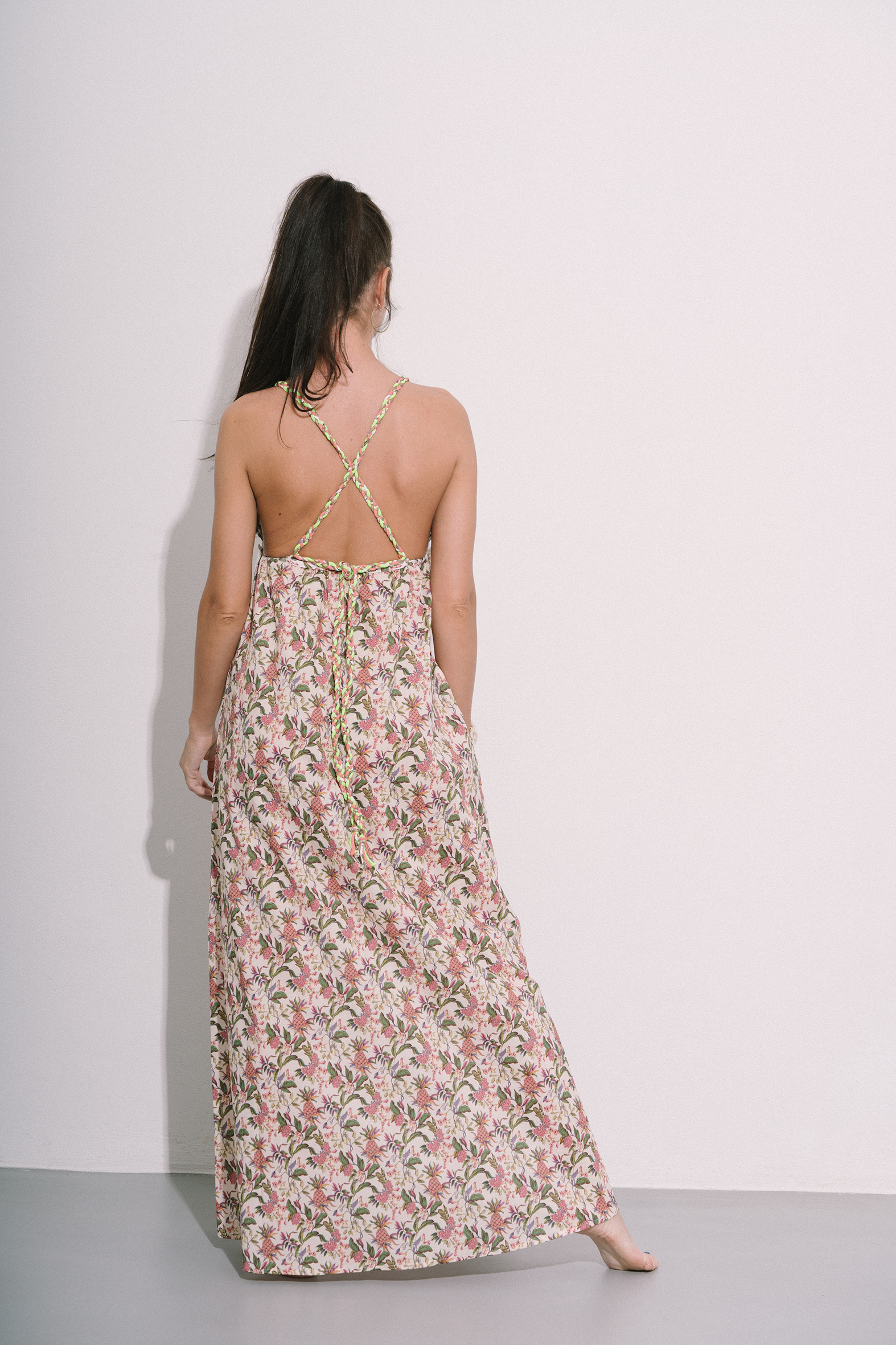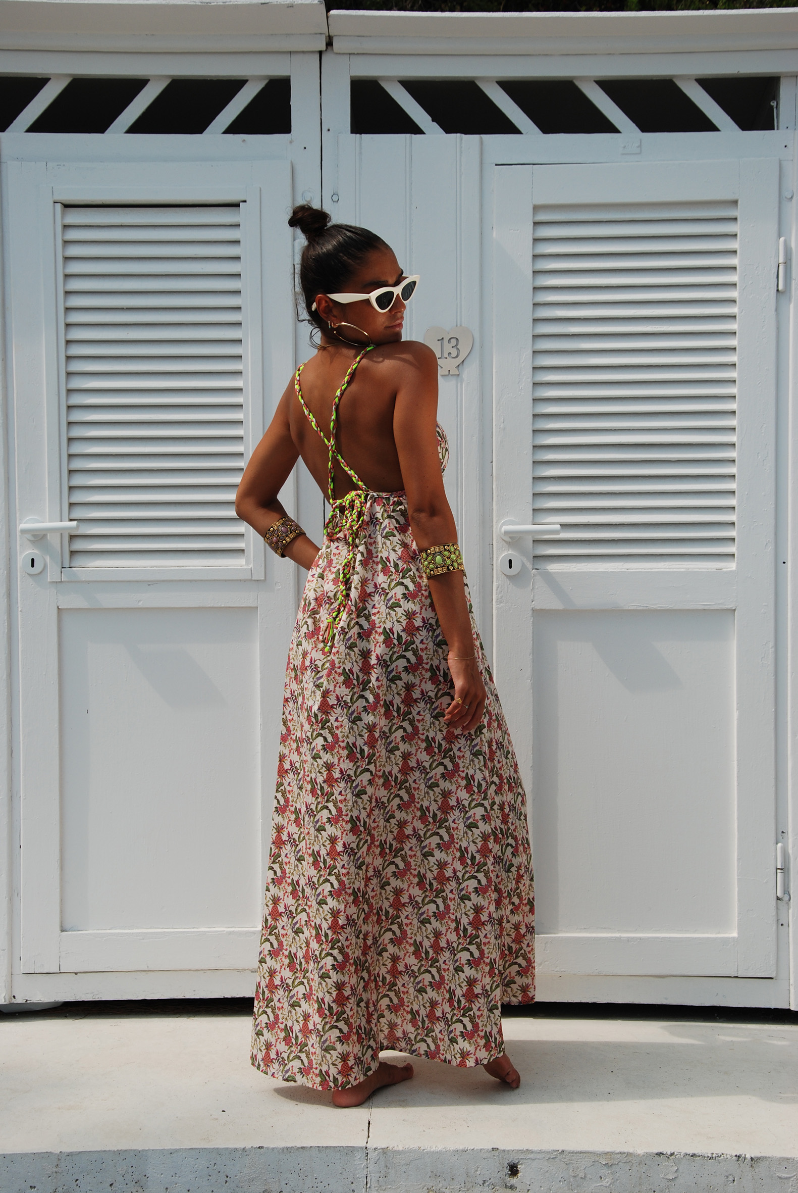 Abito lungo a schiena nuda in cotone; fantasia “Noa Noa”; allacciatura al collo o sulla schiena con fettuccia in lycra multi-color intrecciata a mano; raffinato nastro sotto petto in macramé.