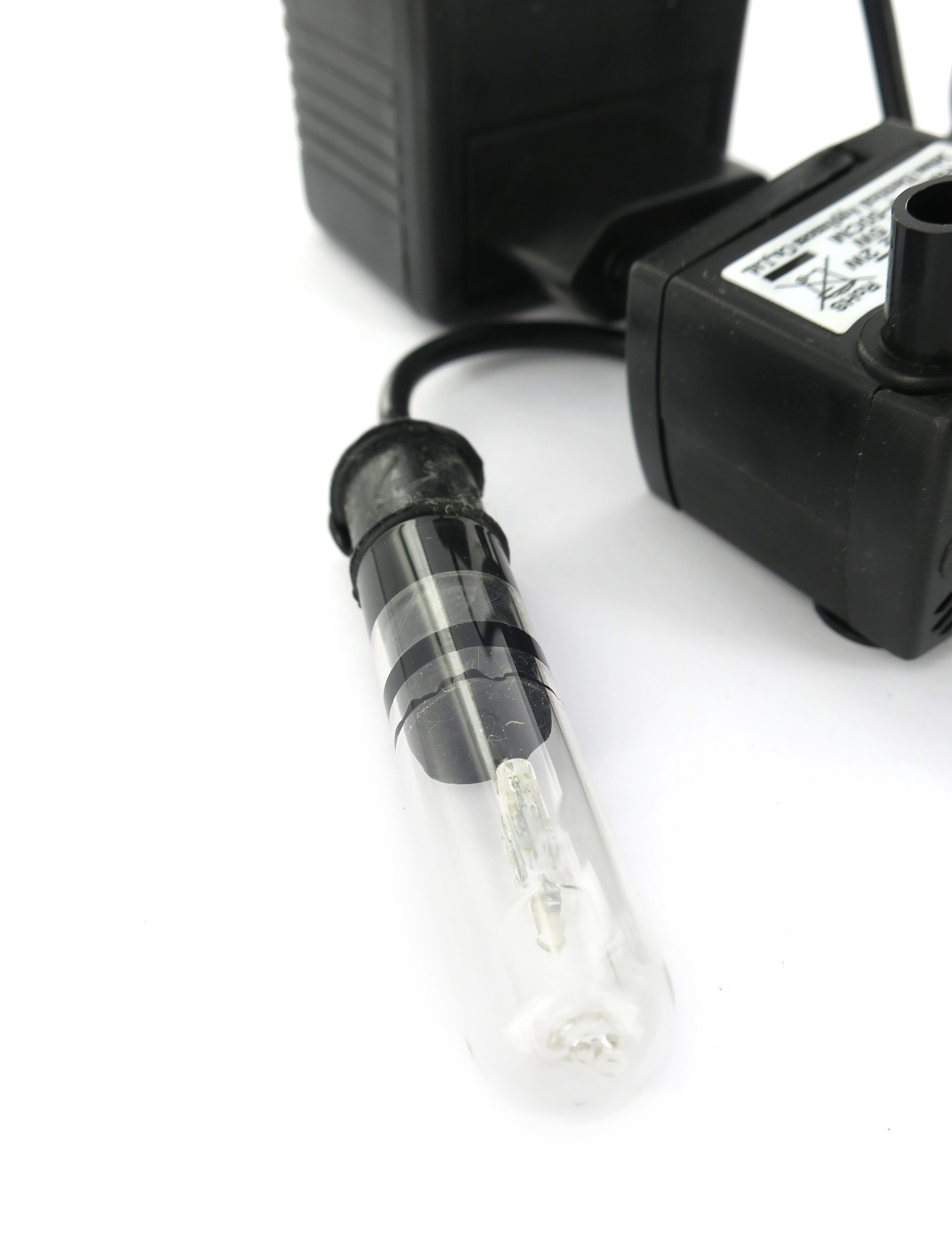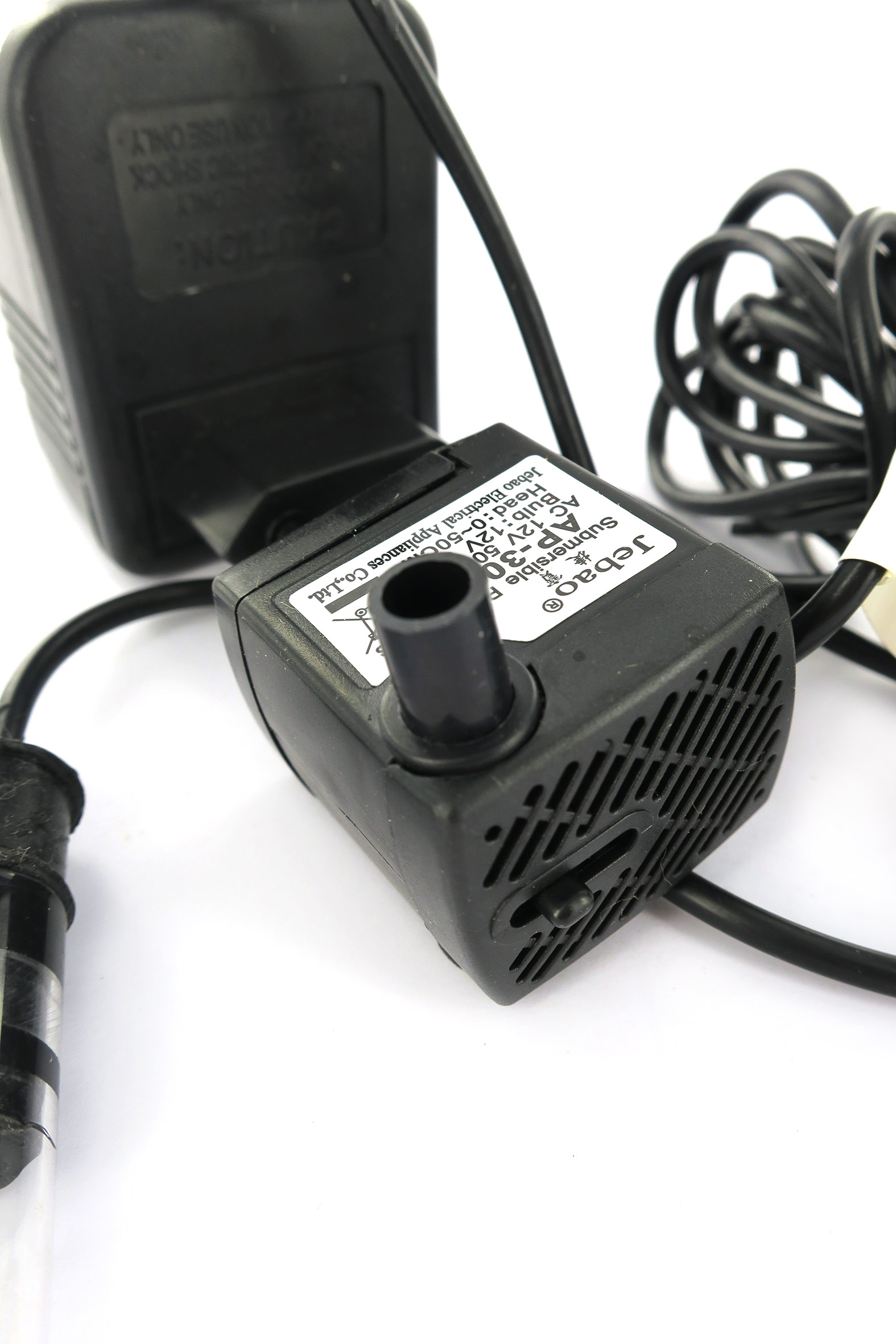 Questa pompa è totalmente sommergibile in acqua e può essere utilizzata al massimo a una temperatura di 35 °C. Nella parte frontale, la pompa è provvista di un regolatore di flusso che consente di variare la portata d'acqua fino a 200 l/h e 35 cm di prevalenza. Dotata di luce bianca a immersione che rende l'acqua più chiara. La pompa non può essere azionata senza acqua. Uso esclusivo in ambiente interno. Adatta per fontane, cascate, grotte o corsi d'acqua in generale. Non adatta per acquari. Alimentazione elettrica 220 V. Dimensioni pompa: 5 x 4 x 3,5 cm.