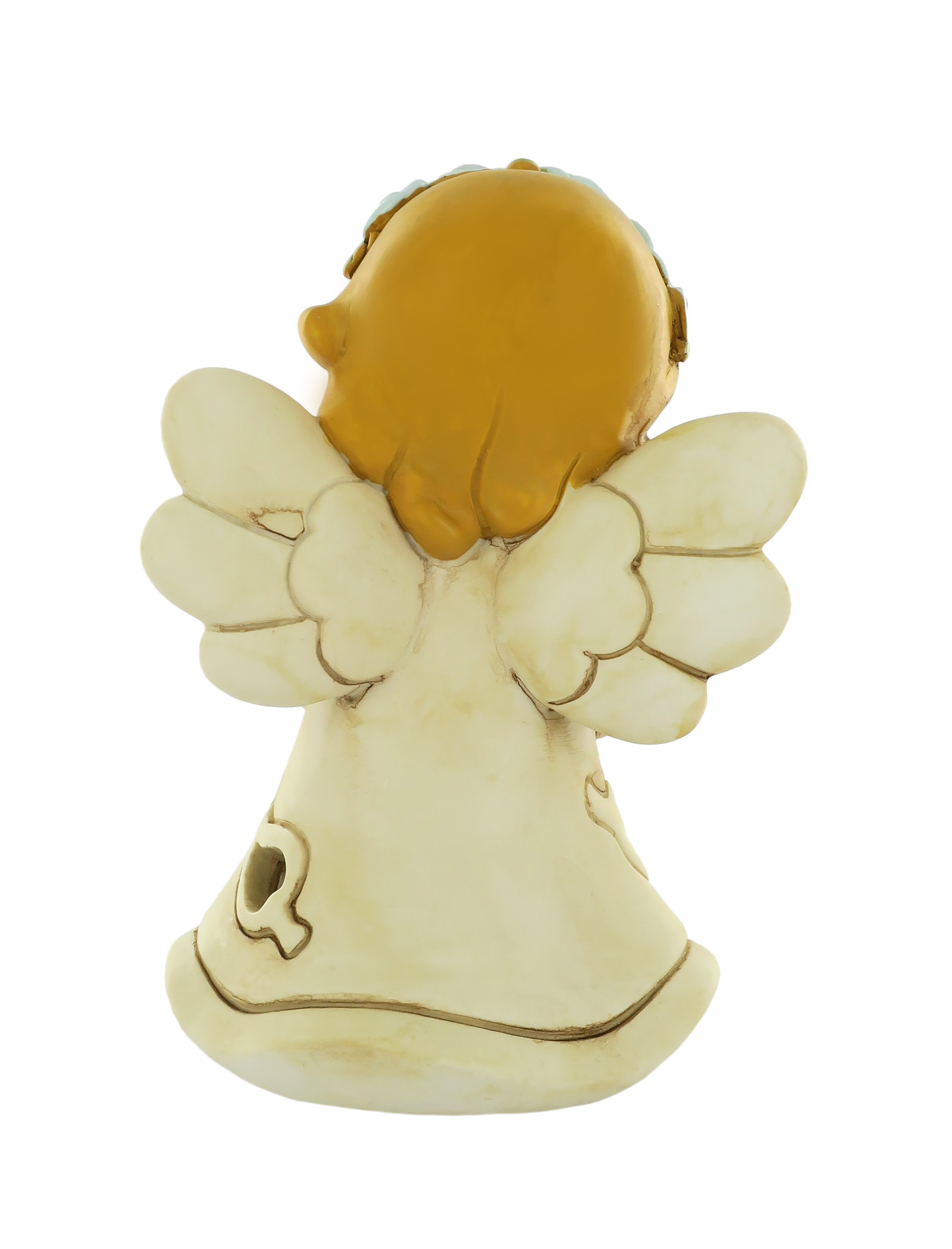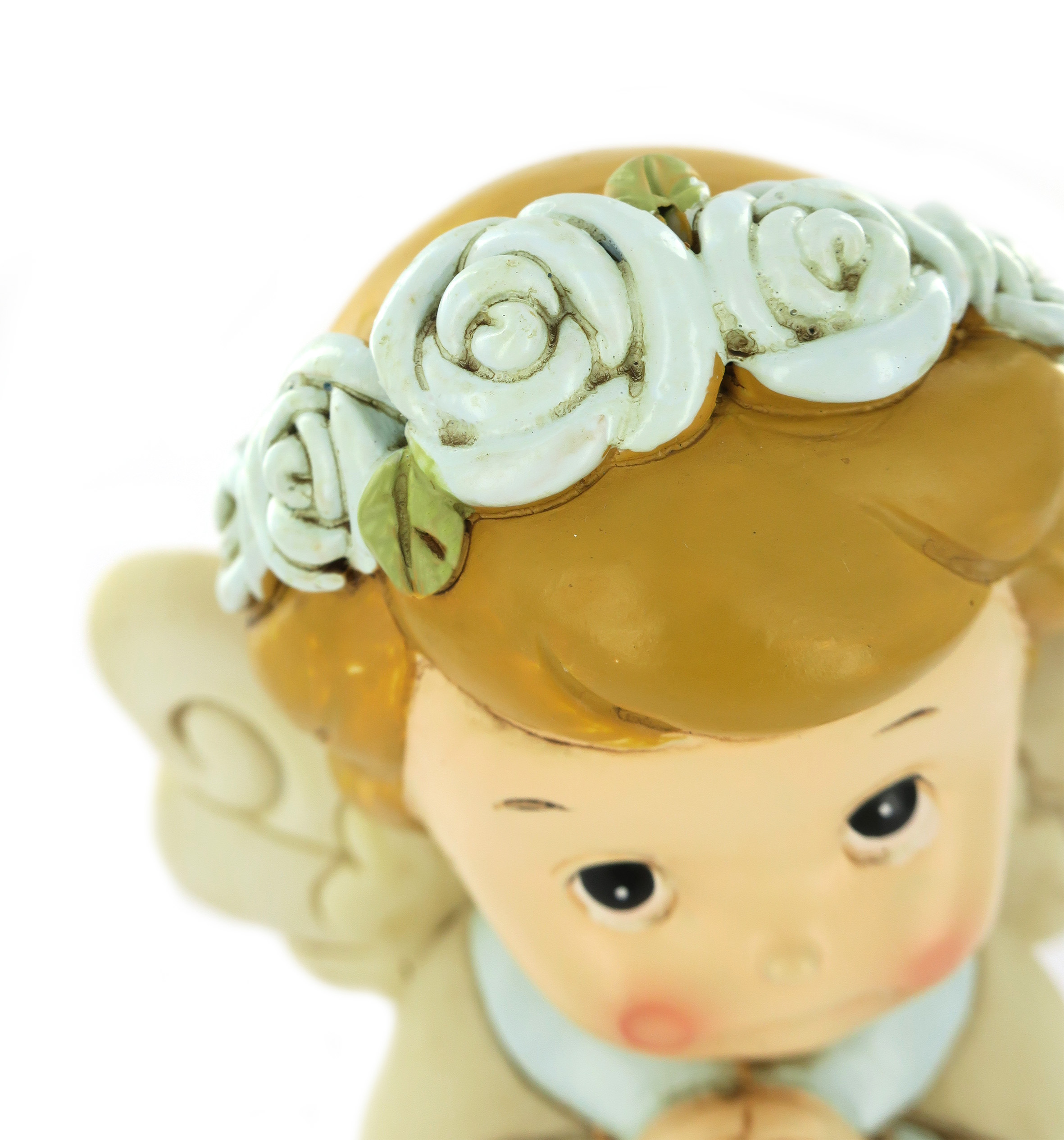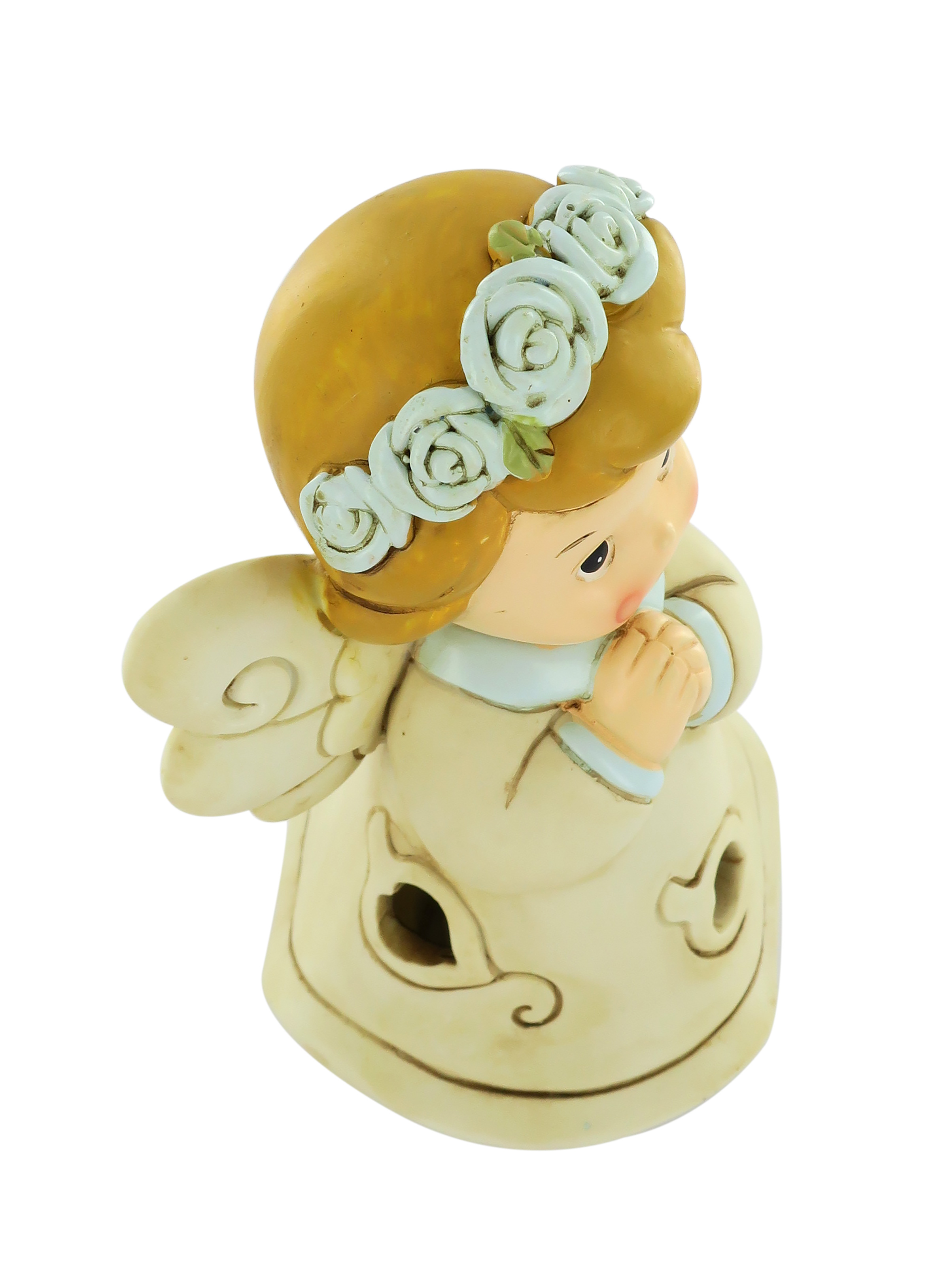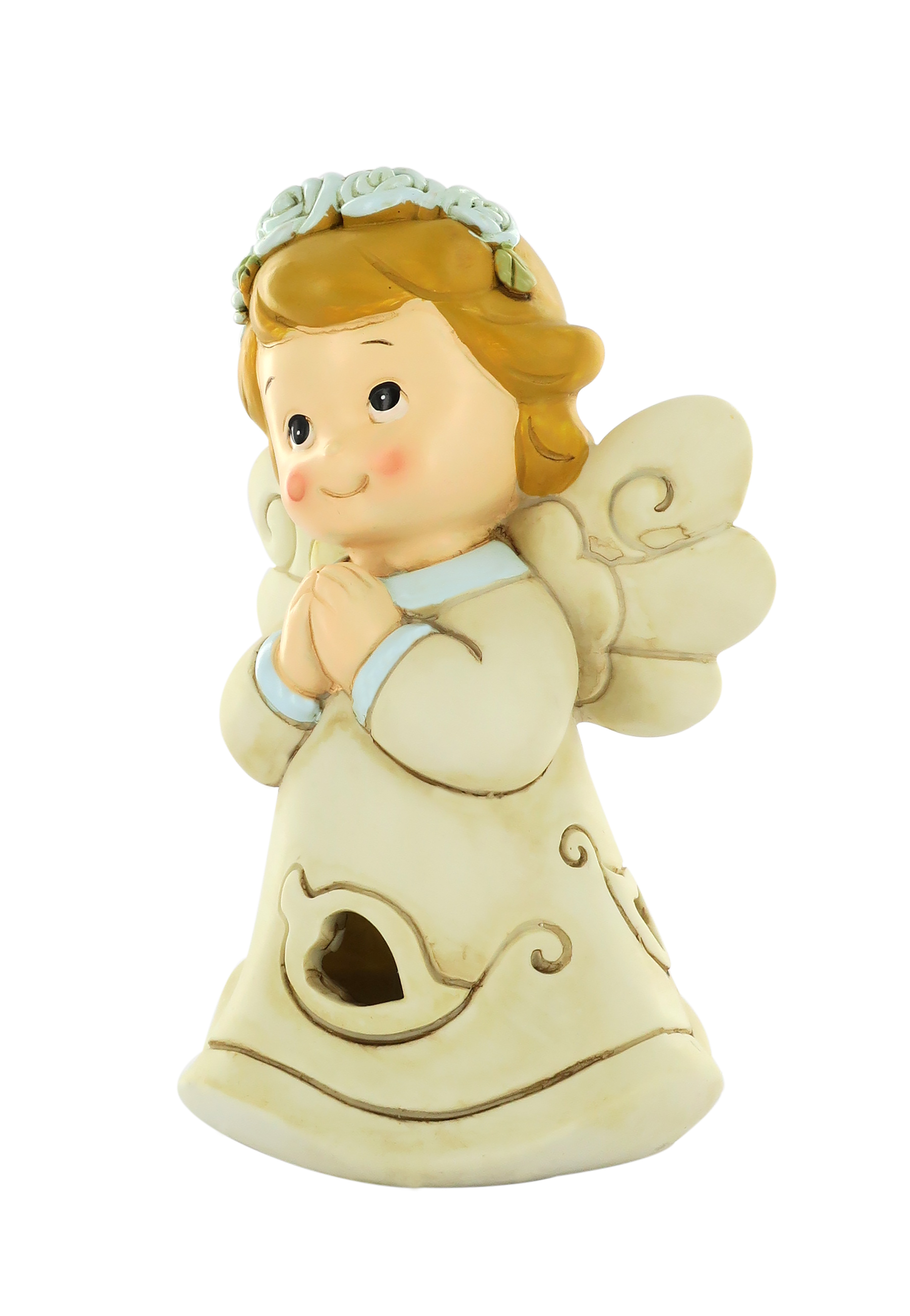 L'angelo che prega con luce, molto adatto per bambini, è una statuina di resina dipinta vuota al suo interno, che ospita una luce LED alimentata da batterie tipo AG3 (spesso usate negli orologi). Le vesti dell'angelo hanno dei fori a forma di cuore, da cui esce la luce prodotta dalla lampadina al suo interno. Il dolce angelo indossa una veste color crema, dagli orli azzurri, e ha le mani conserte in segno di preghiera. Sul volto beato, con gote sfumate, si notano i capelli biondi mossi, adornati da una corona di fiori azzurri. L'uso di colori abbastanza coprenti e opachi dona alla statuina un aspetto molto simile all'argilla.