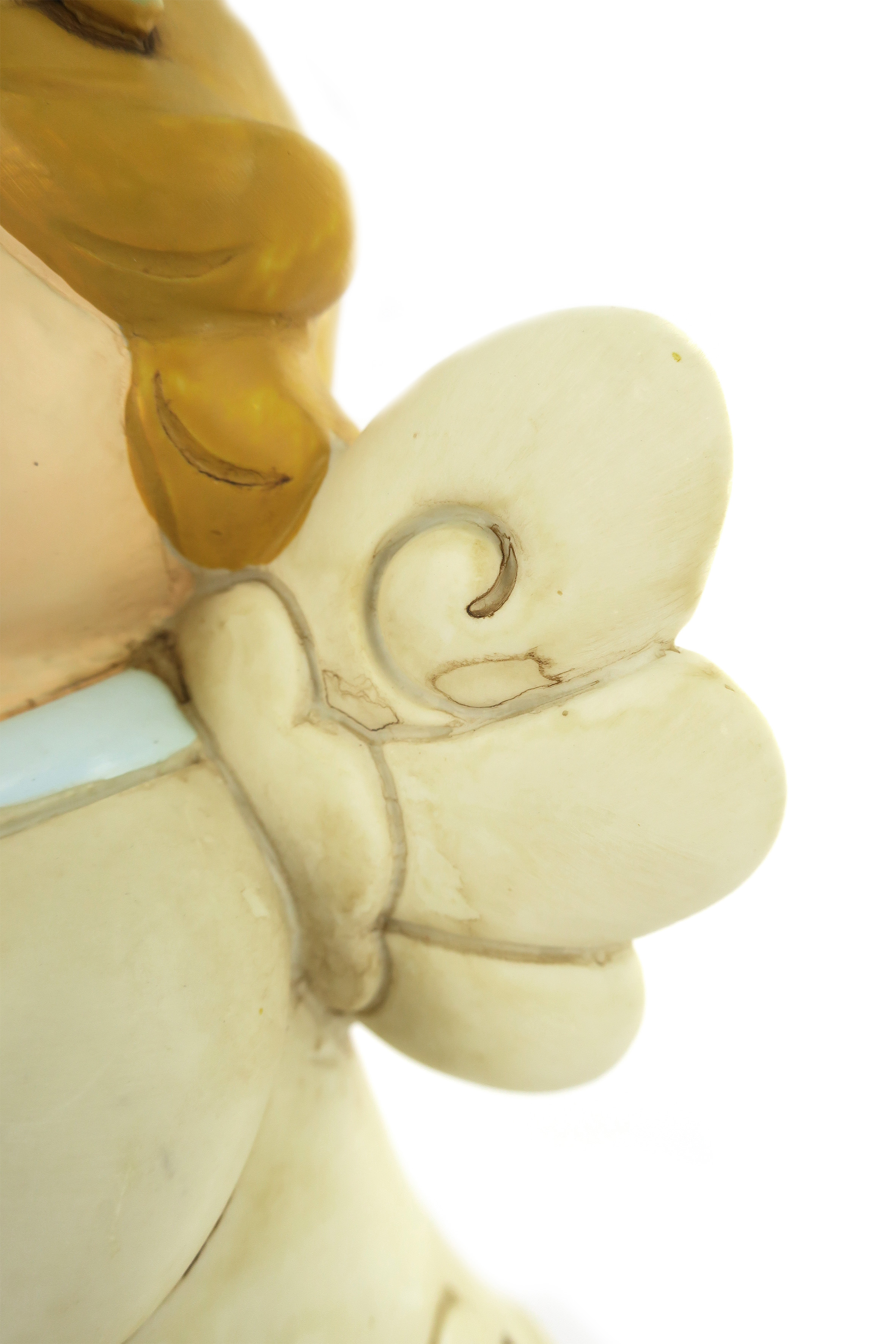 Angelo che prega con luce LED, orli e fiori azzurri, in resina, 15 cm