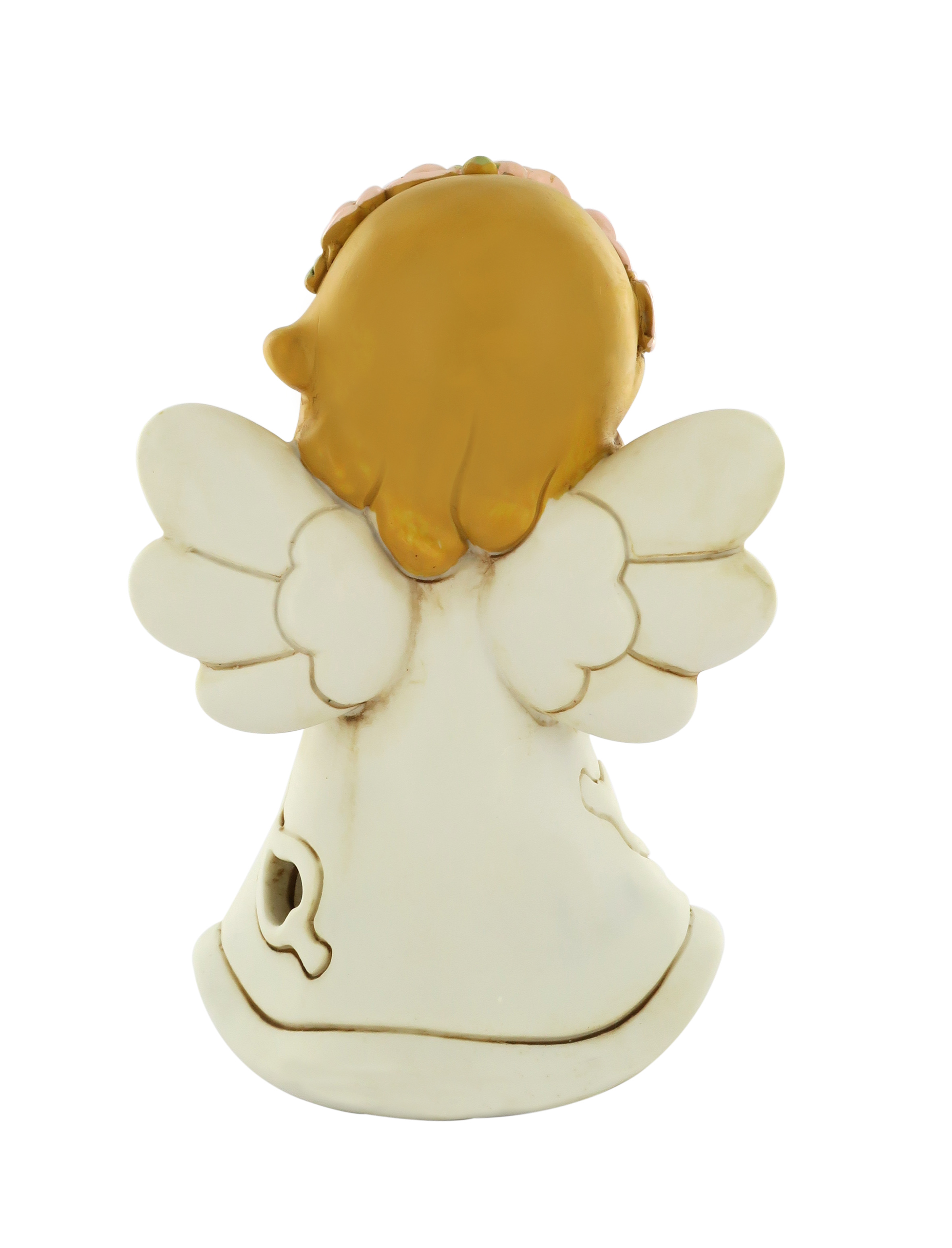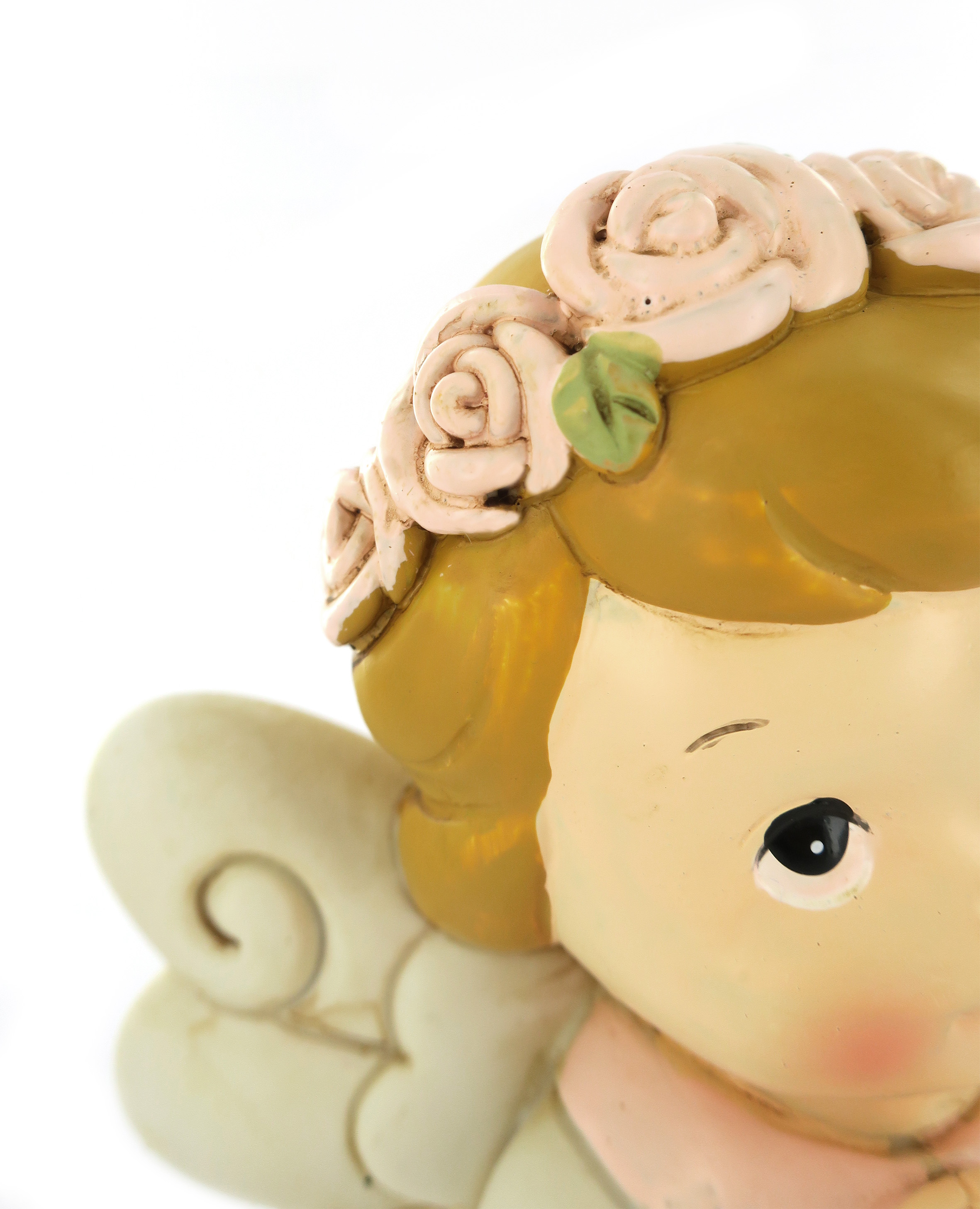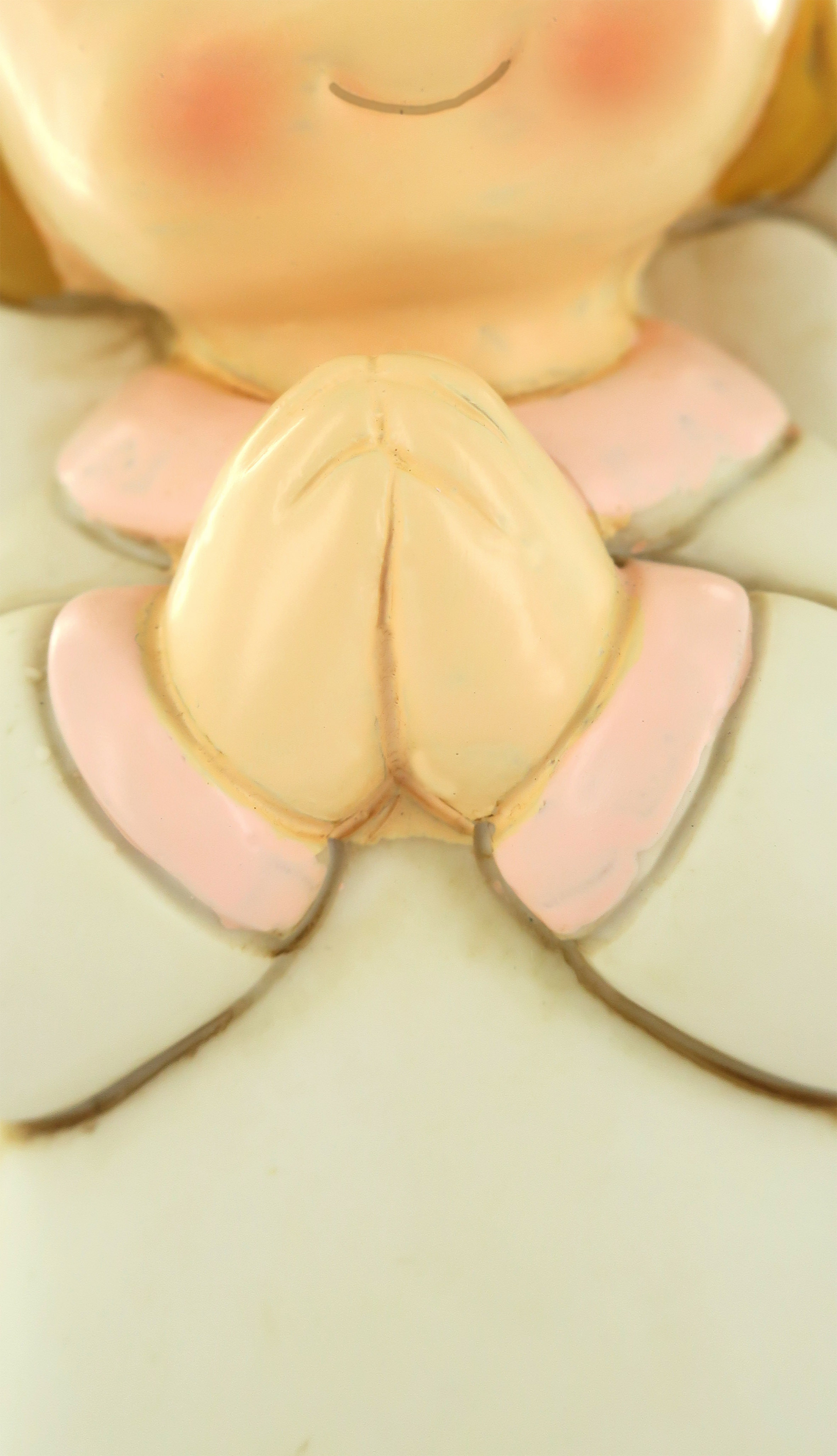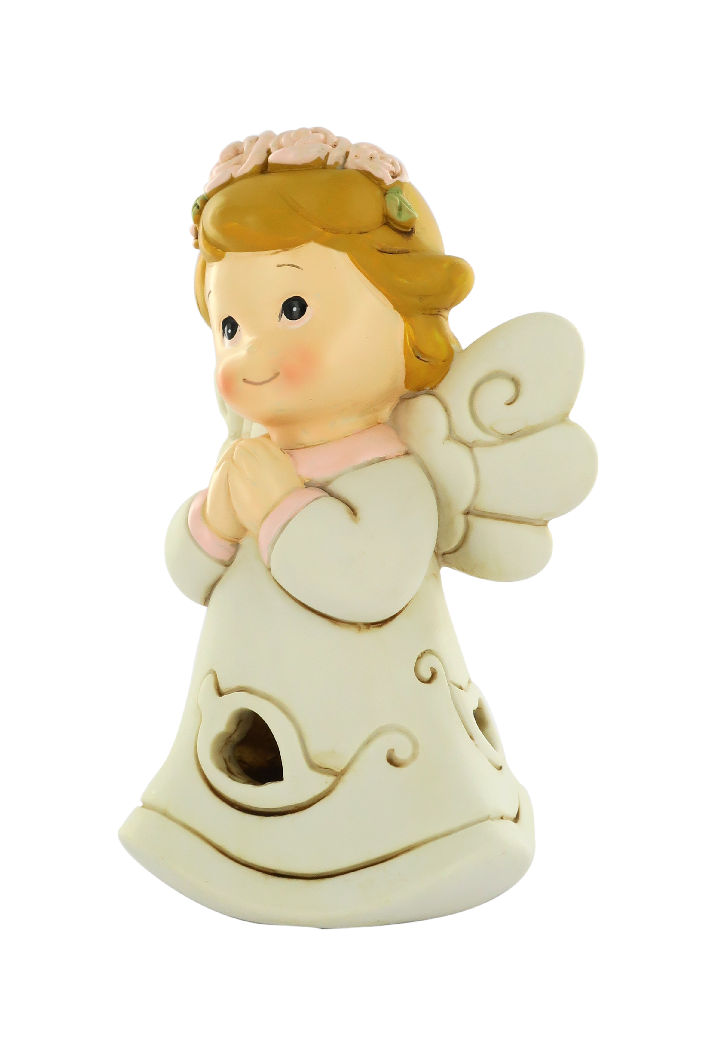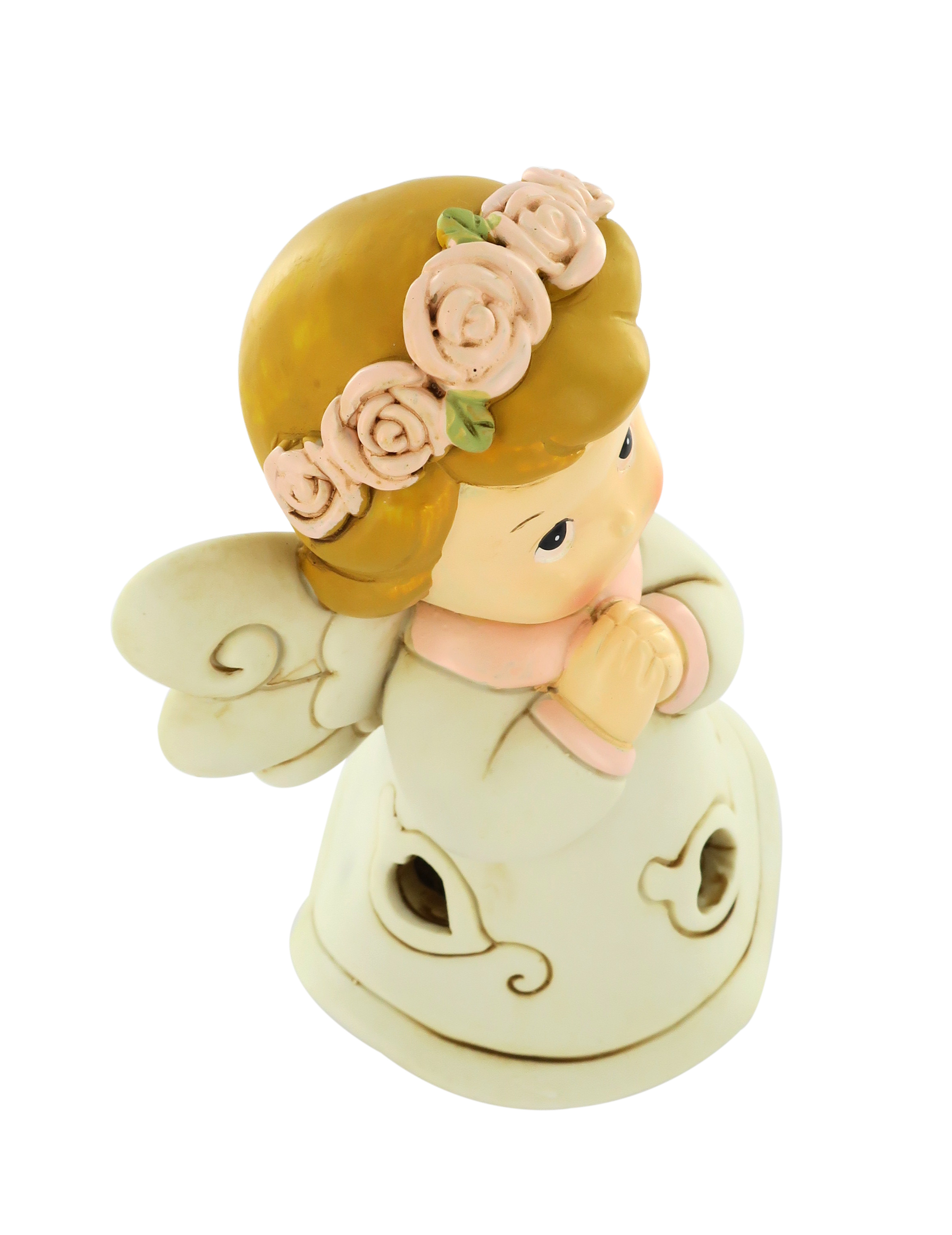 L'angelo che prega con luce, molto adatto per bambini, è una statuina di resina dipinta vuota al suo interno, che ospita una luce LED alimentata da batterie tipo AG3 (spesso usate negli orologi). Le vesti dell'angelo hanno dei fori a forma di cuore, da cui esce la luce prodotta dalla lampadina al suo interno. Il dolce angelo indossa una veste color crema, dagli orli rosa, e ha le mani conserte in segno di preghiera. Sul volto beato, con gote sfumate, si notano i capelli biondi mossi, adornati da una corona di fiori rosa. L'uso di colori abbastanza coprenti e opachi dona alla statuina un aspetto molto simile all'argilla.