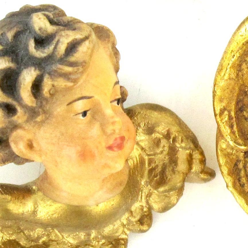 Coppia testine angeli in legno d'acero dipinto a mano con finiture in oro zecchino cm. 5