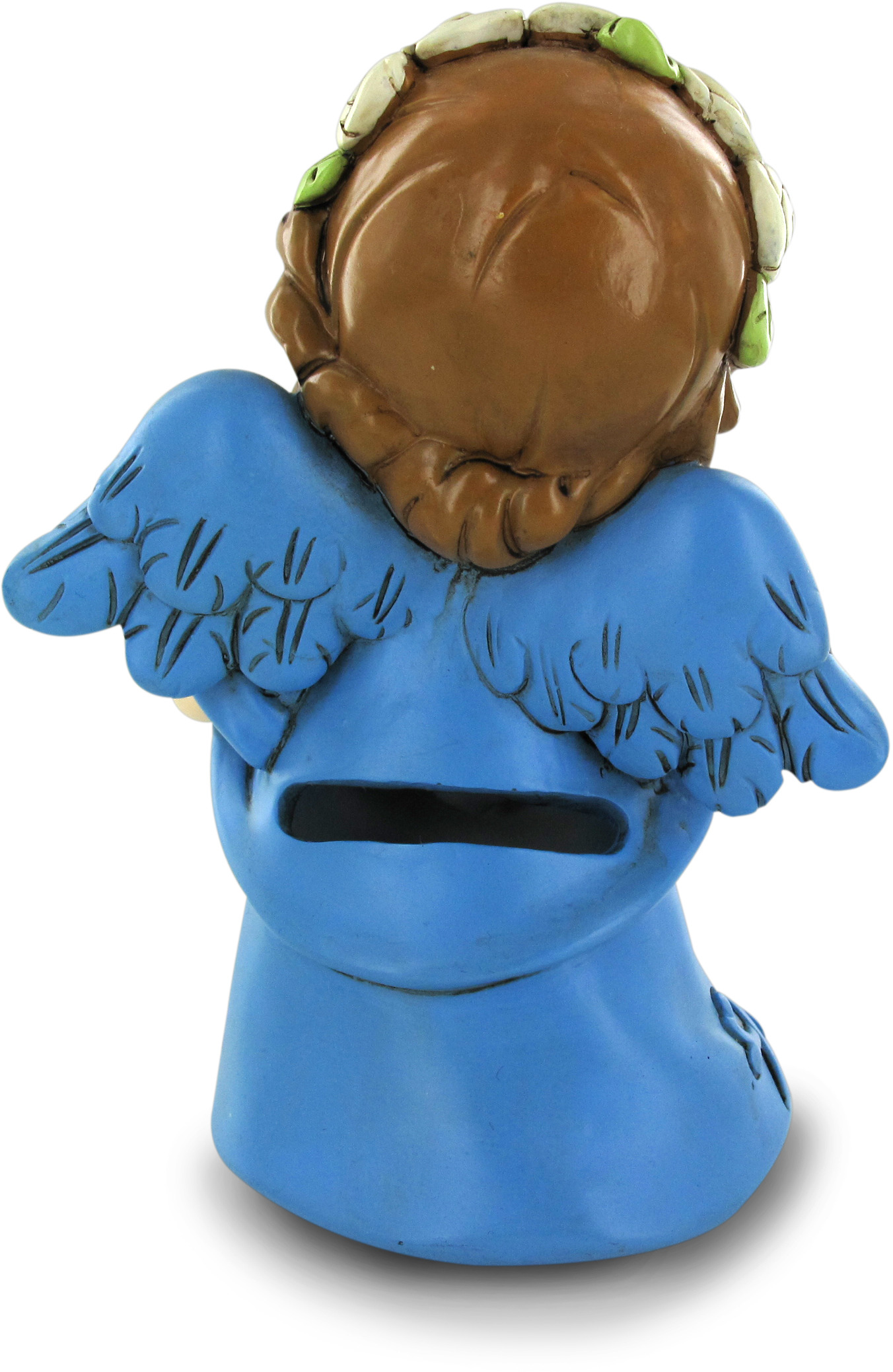 L'angelo salvadanaio azzurro, molto adatto per bambini, è una statuina di resina dipinta con colori molto vivaci, che consente di conservare risparmi (monete, banconote) al suo interno. Il dolce angelo indossa una veste azzurra, come le ali. Nella sua tunica tiene un mazzo di fiori gialli, impreziositi da due strass. Sul volto beato, con gote sfumate, si notano i capelli ricci, adornati da una corona di fiori bianchi. L'uso di colori abbastanza coprenti e opachi dona alla statuina un aspetto molto simile all'argilla.