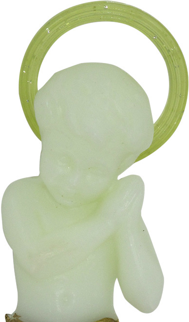 La piccola statuina di Gesù, della misura indicativa di 6 cm, è in plastica fosforescente liscia al tatto. È realizzata in Italia e raffigura il Bambinello sdraiato a braccia aperte e con un ginocchio leggermente piegato. A contorno della sua testa, un’aureola di plastica trasparente con qualche glitter. Un drappo color oro lucido lo copre in vita.