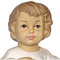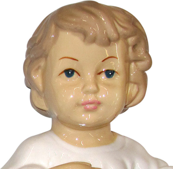 Realizzata in ceramica, raffigura un Gesù Bambino beatamente sdraiato sulla schiena, dell'altezza di 13 cm, con il volto leggermente volto a sinistra. La raffinata rifinitura lucida, che conferisce alla figura molta luminosità, evidenzia ancora di più le linee dettagliate del piccolo corpicino, le pieghe delle vesti immacolate e le ondeggiature dei capelli. I colori utilizzati sono tenui, donando alla graziosa statuetta un'aria delicata e classica.