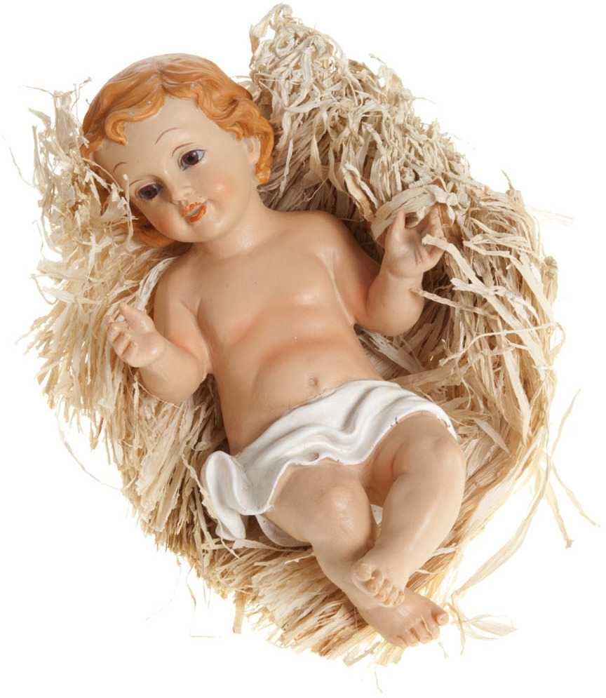 Questa statuina di Gesù Bambino, parte della Linea Natalizia di Ferrari & Arrighetti, è il simbolo della nascita del Salvatore. Raffigurato a braccia aperte e col viso rivolto al cielo, il bambino poggia sulla schiena sopra un giaciglio di simil-paglia che vuole ricordare il fieno della mangiatoia usata come culla nella capanna della Sacra Famiglia.
