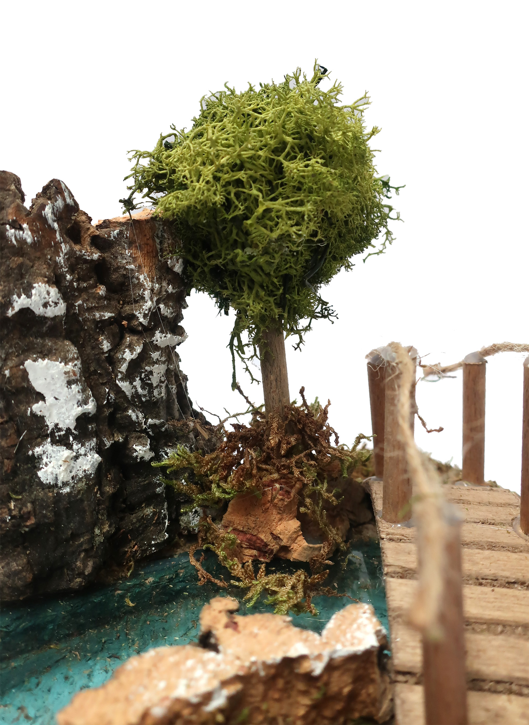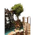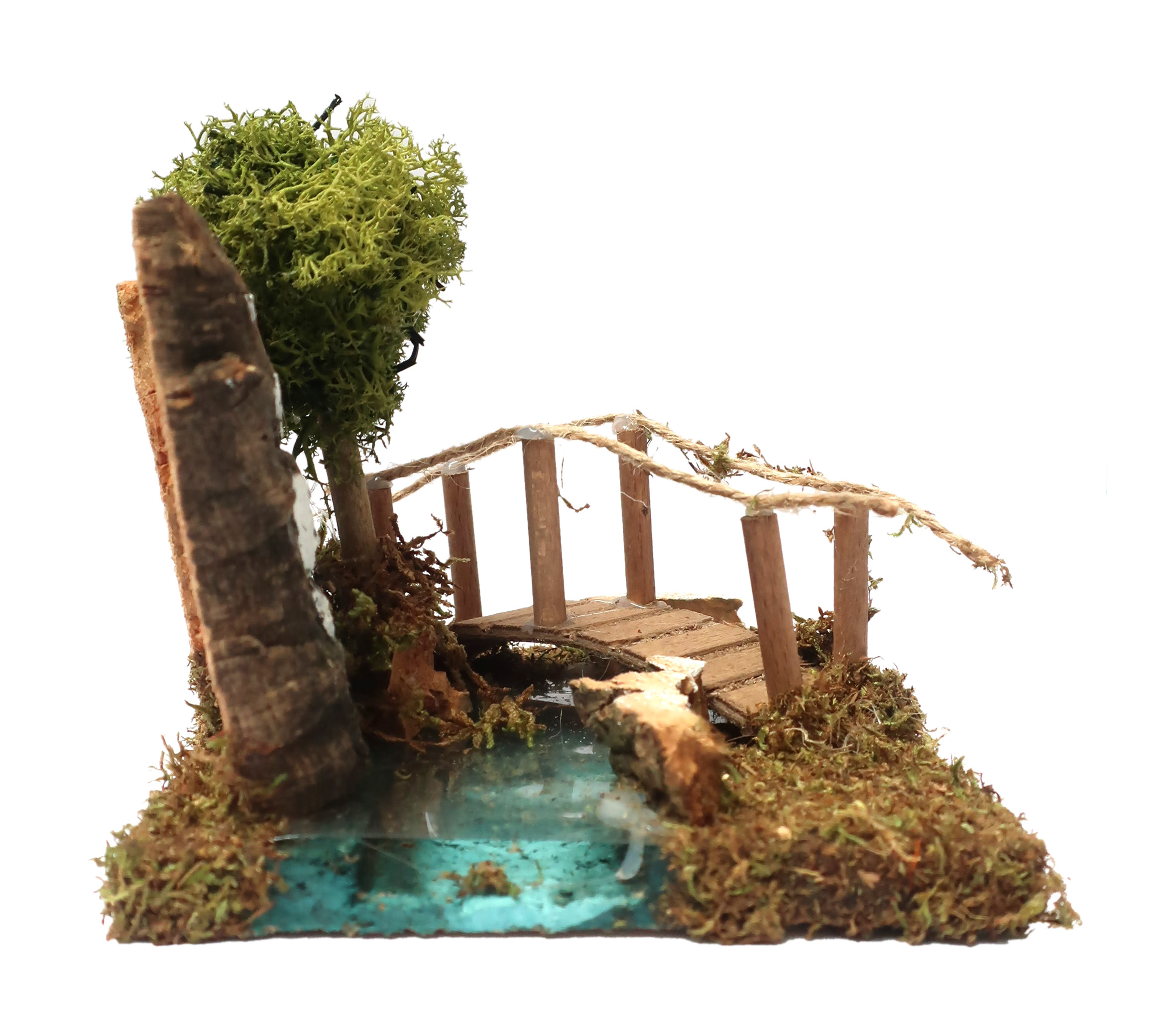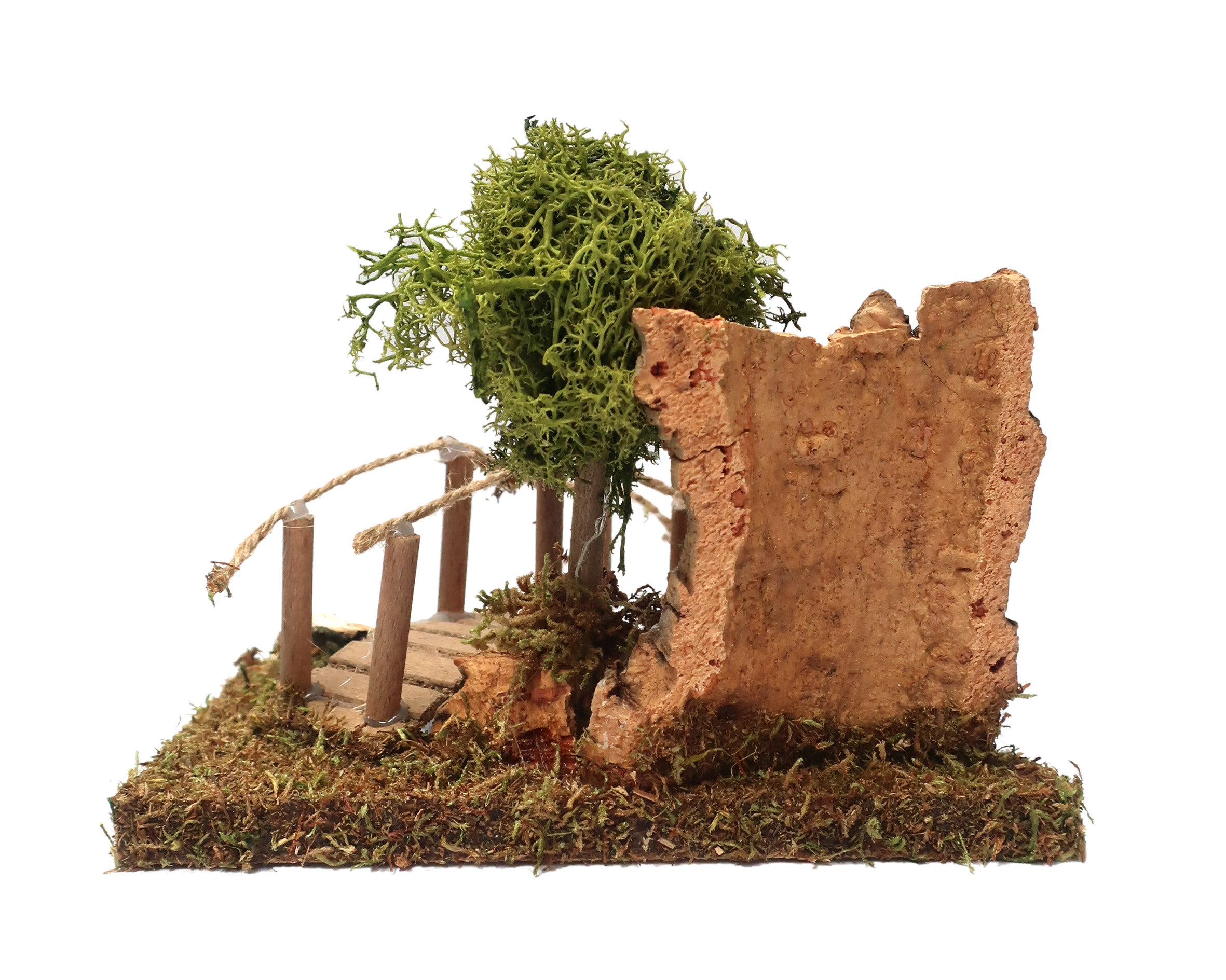 Accessori per presepe: Curva con albero e ponticello. Dimensioni: 13 x 16 x 13 cm. Materiali: Legno, sughero, muschio e lichene. Realizzato artigianalmente in Italia. Questo elemento decorativo per presepe è realizzato con minuzia di particolari e risulta perfetto per un presepe agreste ricco di aree verdi. Questa decorazione per presepe include un tratto di fiume a curva, un ponticello in legno con dettaglio in corda, un alberello e altri elementi decorativi che ricordano elementi della vegetazione. La superficie, per rendere l'effetto erba, è rivestita di muschio a fibre allungate, che richiamano appunto il manto erboso. Questo accessorio per presepe, realizzato in Italia da artigiani che creano oggetti per presepe da decenni, si distingue per l'uso sapiente di materiali selezionati tipici della tradizione, che permette d'ottenere accessori per presepe di qualità. Il tratto di fiume con ponticello e alberello è ideale da usare insieme ad altri tratti di fiume compatibili, in modo da poter creare un corso di fiume elaborato e personalizzato in base a vostri gusti e agli altri elementi del vostro presepe. In punto iniziale del corso del fiume potrebbe essere rappresentato da una cascata, il proseguimento del corso potrebbe essere realizzato con diversi tratti di fiume di varia forma, mentre per realizzare la parte finale del fiume si può usare il laghetto o lo stagno. Essendo il corso del fiume disegnato e ricoperto da una pellicola plastica, che simula la tridimensionalità del corso dell'acqua, questo tratto di fiume come tutti gli altri della collezione NON sono destinati a ospitare acqua o altri liquidi.
