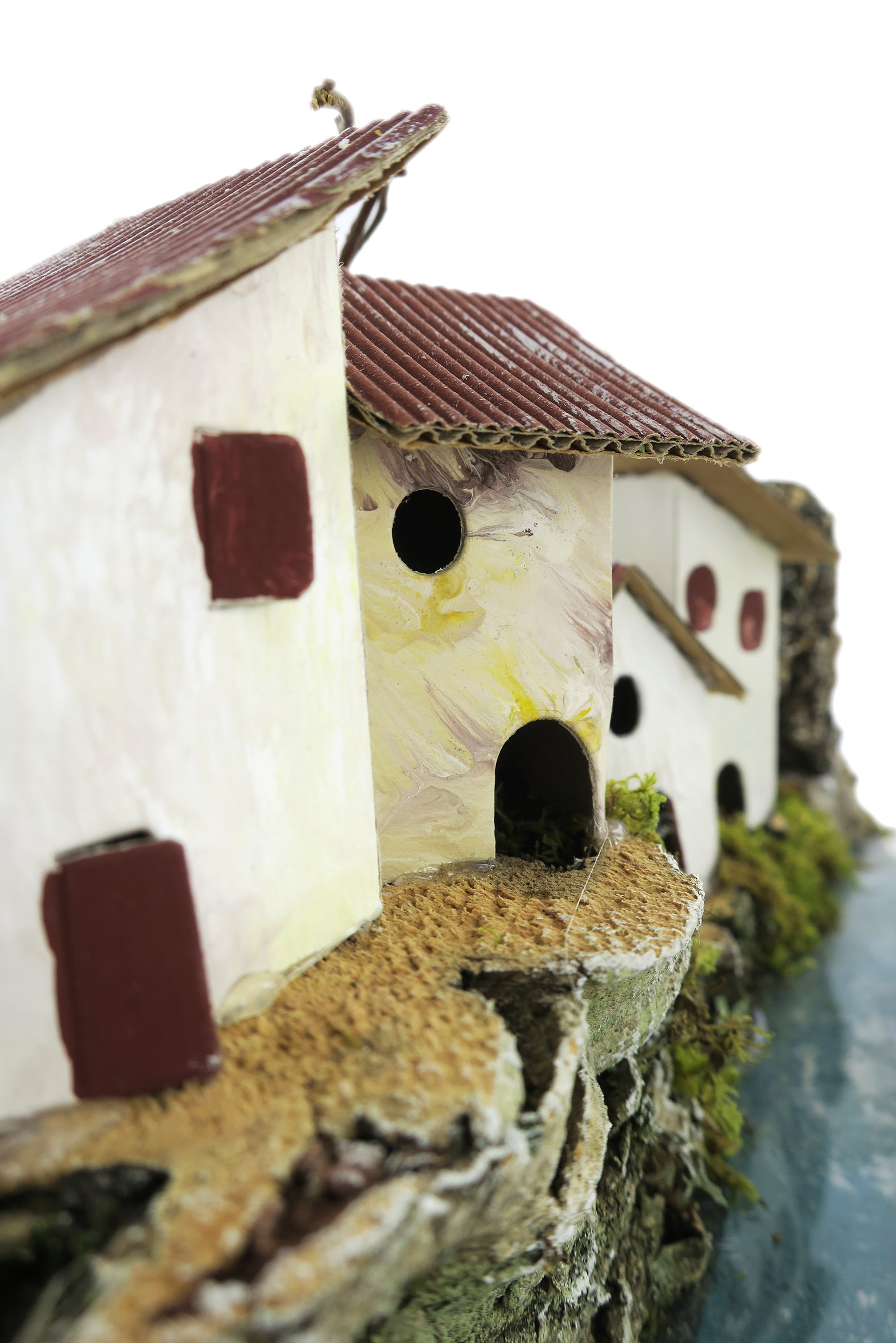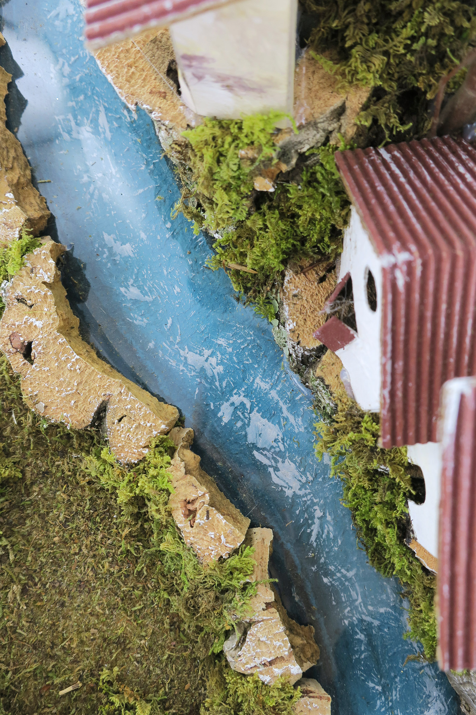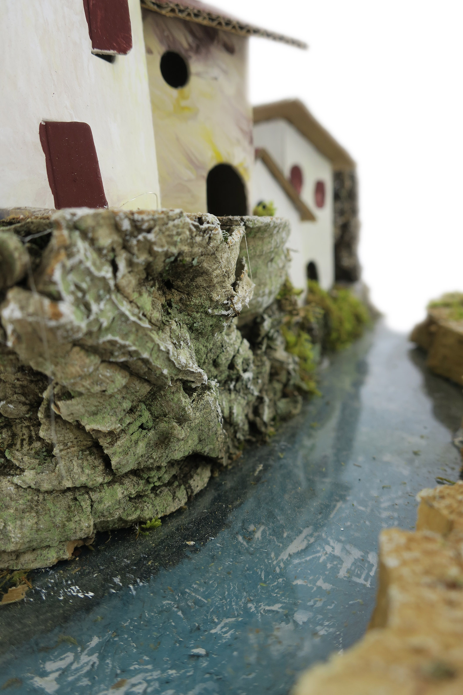 Accessori per presepe: paese sul fiume. Dimensioni: 26 x 18 x 11 cm. Materiali: legno, sughero e muschio (tranne le cassette realizzate in cartone). Realizzato artigianalmente in Italia.