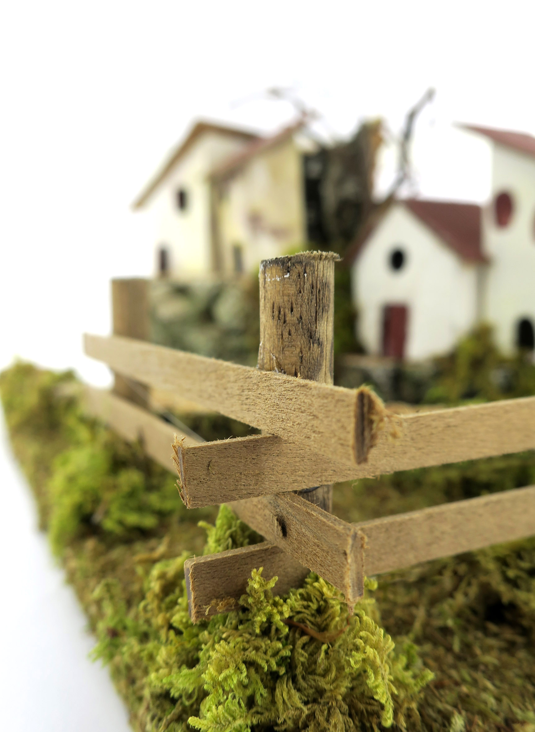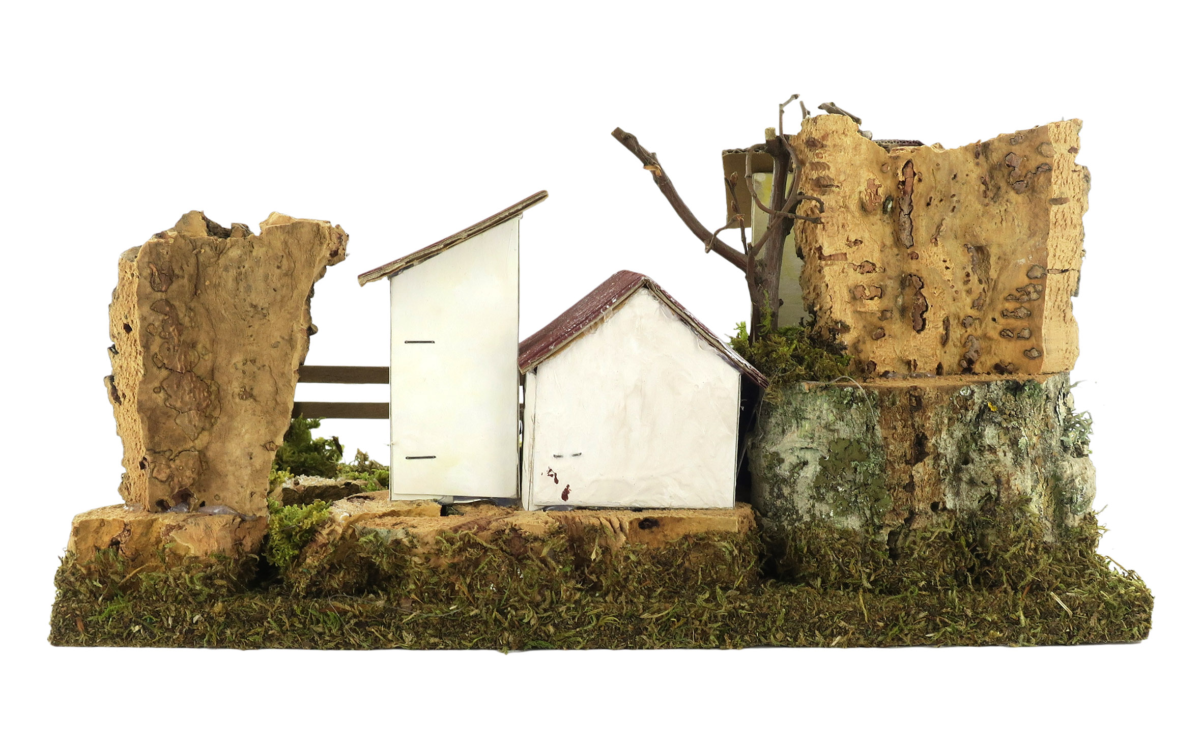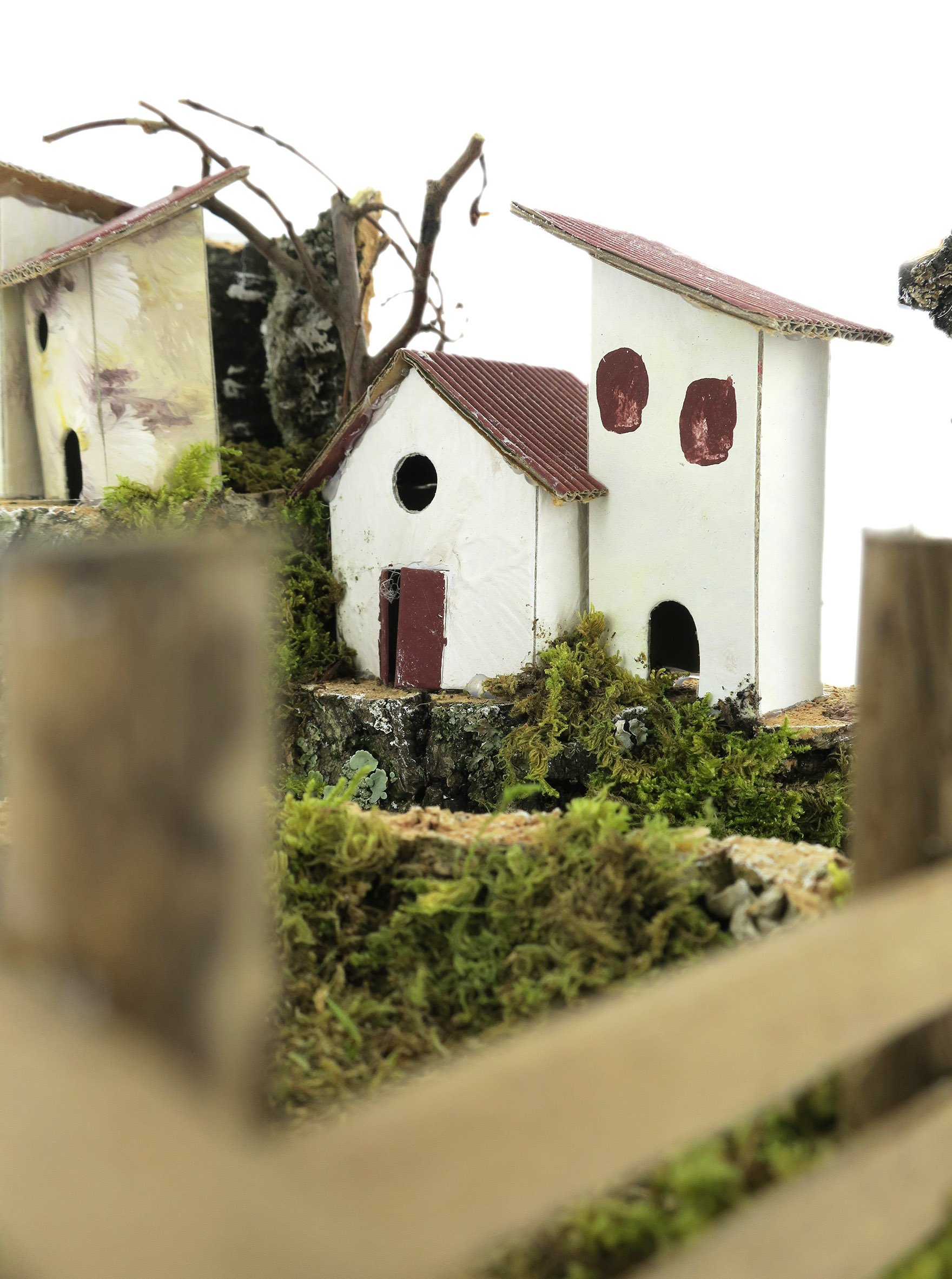 Accessori per presepe: paese sul fiume. Dimensioni: 26 x 18 x 11 cm. Materiali: legno, sughero e muschio (tranne le cassette realizzate in cartone). Realizzato artigianalmente in Italia.