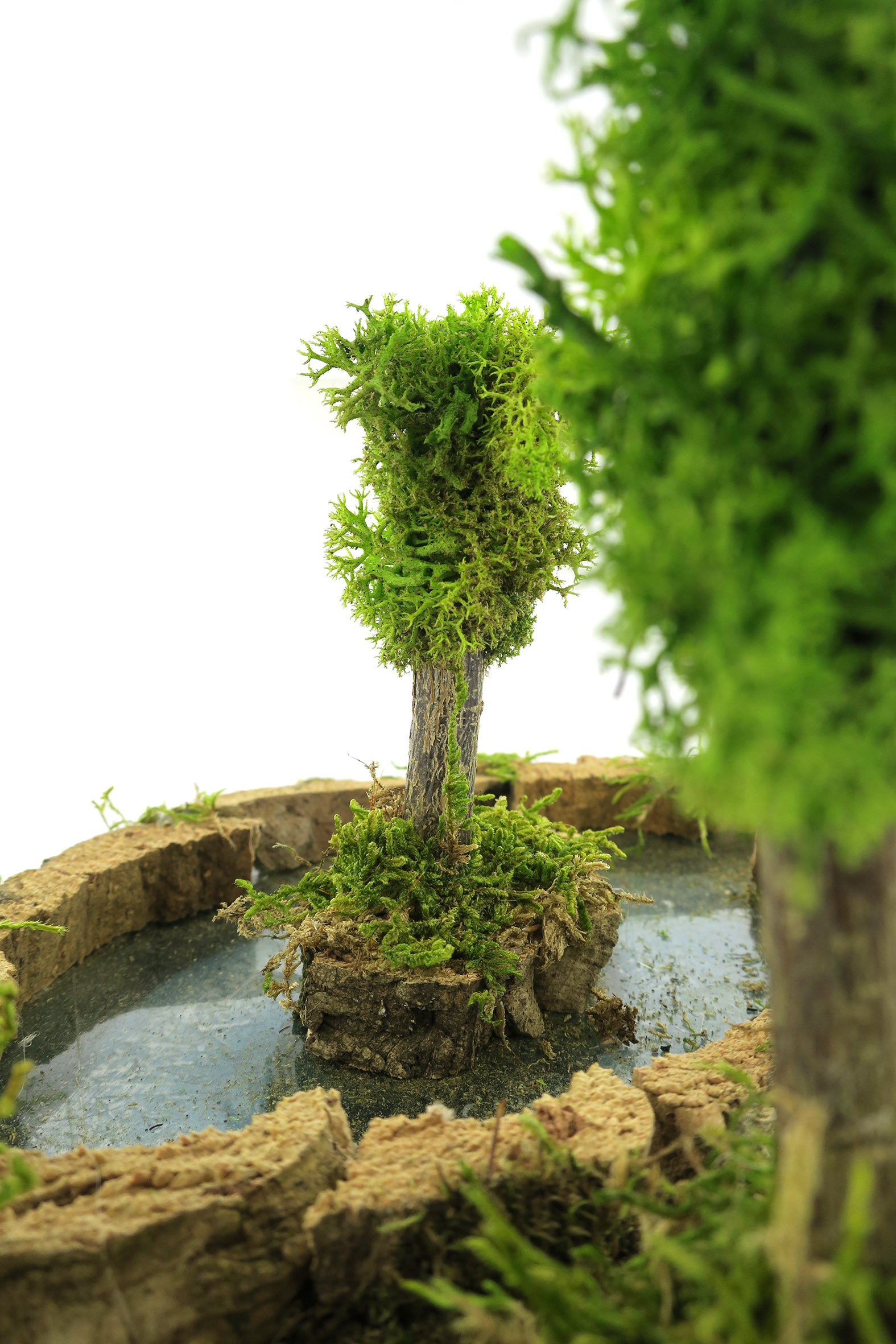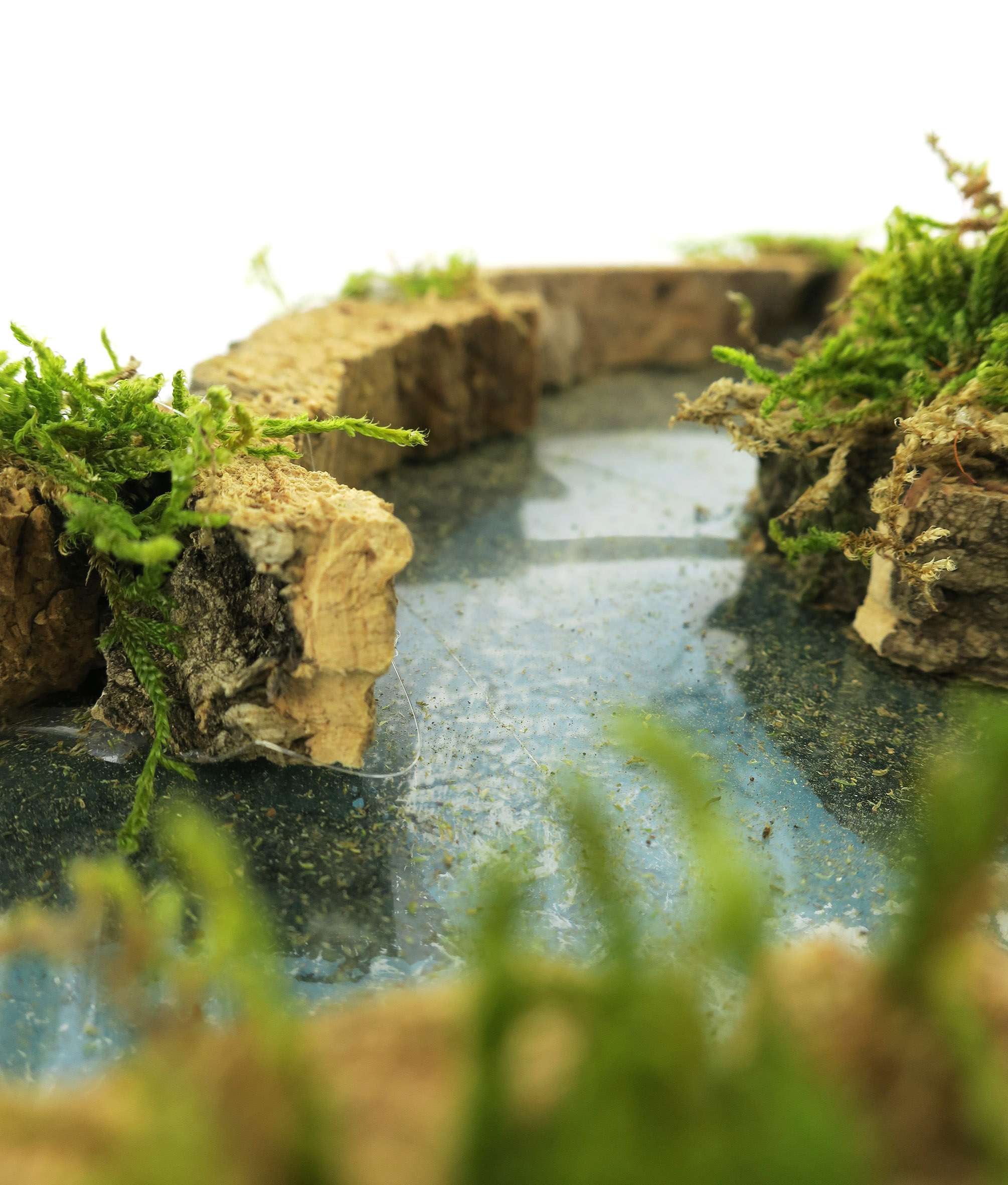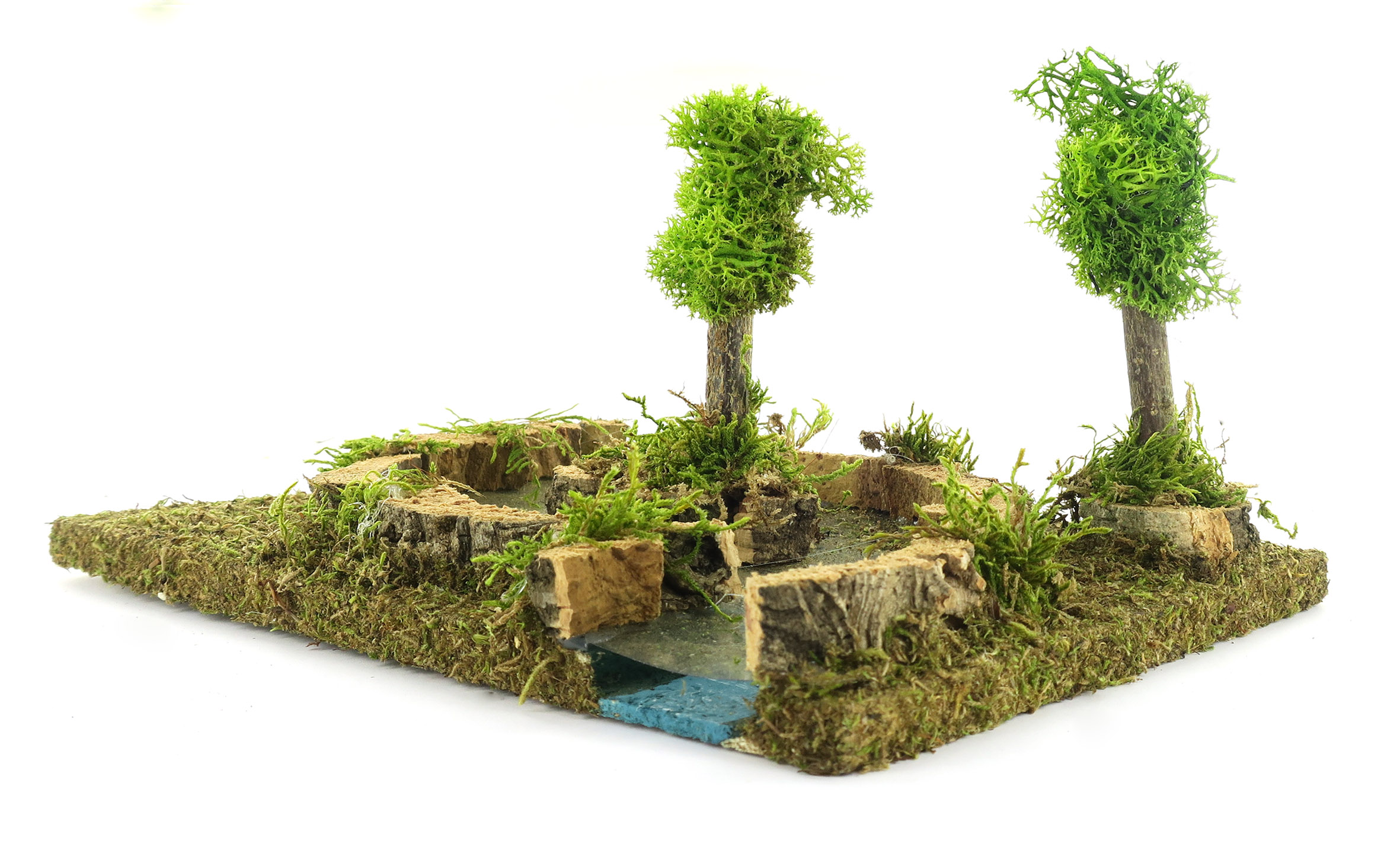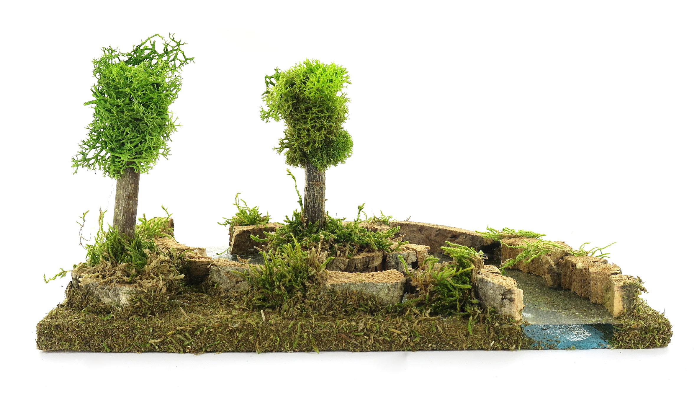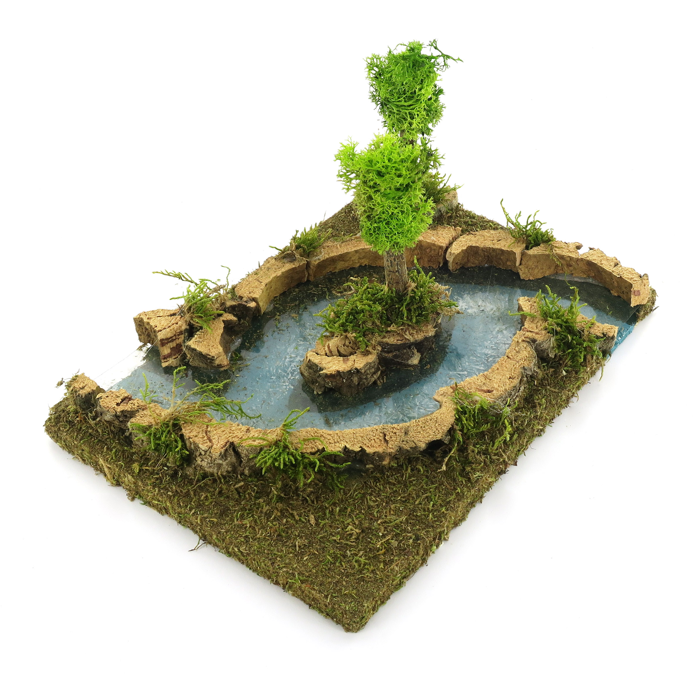 Accessori per presepe: Tratto di fiume con isolotto alberato. Dimensioni: 26 x 18 x 11 cm. Materiali: Legno, sughero, muschio e lichene. Realizzato artigianalmente in Italia.