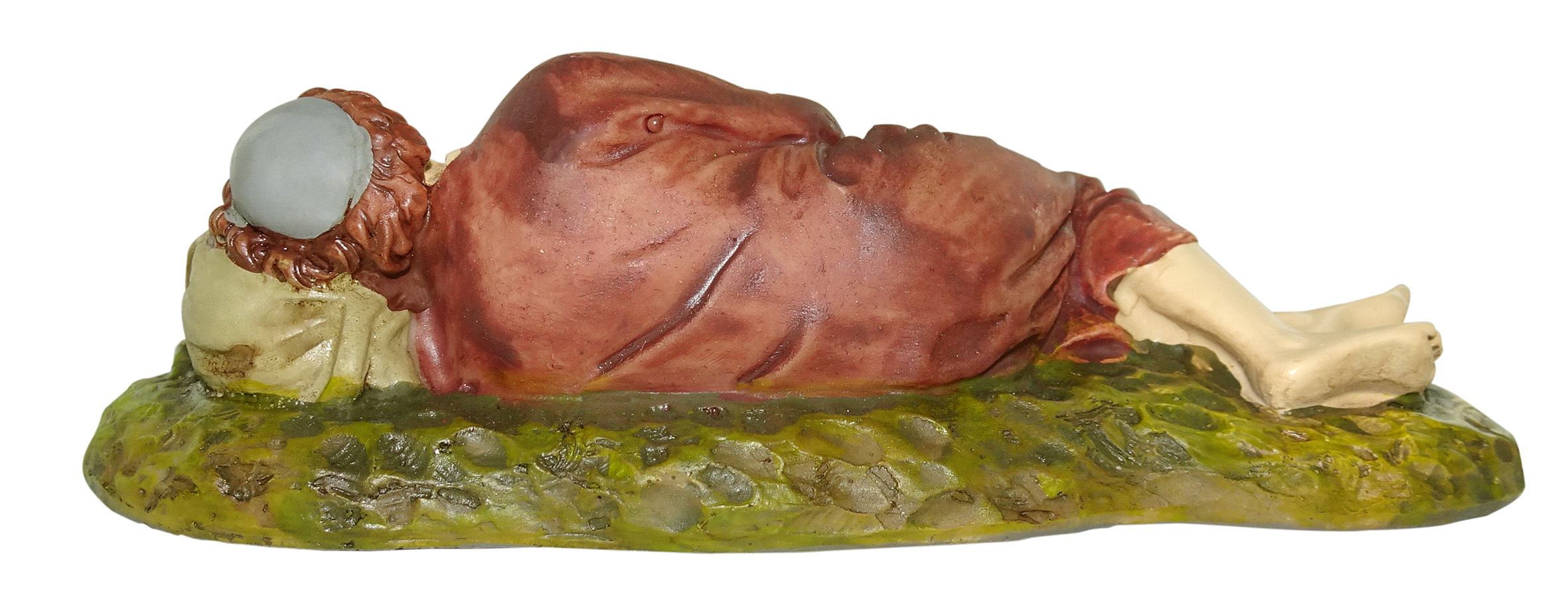 La statuina del pastore dormiente per presepe Landi da 10 cm, in resina colorata e rifinita a mano, è stata ideata dallo scultore d’arte sacra Martino Landi e rappresenta un pezzo che non può mancare nel vostro presepe tradizionale. Il pastore è raffigurato mentre, sdraiato sull’erba, riposa su un fianco, con la testa appoggiata ad un cuscino. Insieme al pastorello, trova riposo anche una pecorella, che dorme beata al fianco del padrone. La sinuosità delle linee della tunica marrone del pastore, così come la fedeltà di riproduzione dei dettagli del pelo dell’ovino, rappresentano la firma di Landi, che rimane sempre fedele alla tradizione, proponendo personaggi e particolari resi con precisione artigianale.